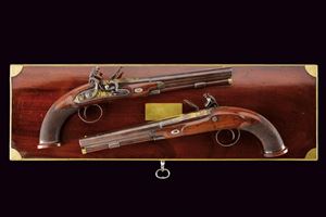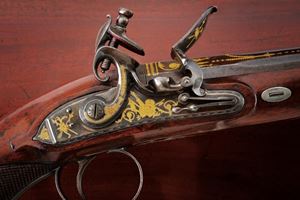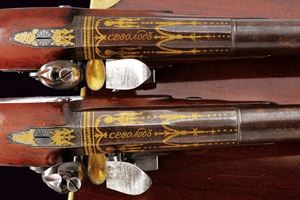 Canne lisce, con culatta ottagonale, poi con un segmento faccettato, un'anellatura al cambio e infine tonde. Dotate entrambe di mirino dorato. Recanti nel primo terzo una bellissima decorazione a baldacchino, incisa e ageminata in oro che sormonta la firma in cirillico "Всеволод" (Vsevolod), la culatta con cornicette in oro, come anche il rivestimento del focone. Attorno ai mirini una ghirlanda di foglie attraversata da un fregio longitudinale sul quale si incrociano due sciabole. In volata cal. 18, 4mm. Anime in buono stato di conservazione, con leggera patina di ossidazione. Sul lato inferiore della canna una spessa bindella nel tipico gusto inglese. I codoli in un elemento separato, con cornice di foglie incisa e trofei di tamburi e armi ageminati in oro, sulla superficie di un tamburo presente un giglio. Batterie sempre di gusto inglese con snello cane ageminato in oro con un globo, foglie ed altri piccoli fregi. La cartella con trofei d'armi, scudi e ancora la raffigurazione di un globo. Lo scodellino foderato d'oro all'interno. La martellina dotata di rotellina antifrizione alla molla. Meccaniche ben funzionanti. Mezze casse in noce con impugnatura zigrinata. Ponticelli incisi con trofei, cornicette ed altri elementi. Le cocce piane e recanti foglie e rosette incise. Bacchette in legno con battipalla in ottone. In alcuni punti lievi resti di finitura antica sulle parti in ferro. L'imboccatura delle casse in corno bruno. In una cassetta in legno da trasporto dotata di vari accessori, quali fiasca, cacciaviti, bacchetta di pulizia ed altro. Munita di chiave e completa di un curioso sistema di viti a scomparsa, avvitabili tramite un'apposita chiave che permette di fissare la cassetta a un supporto. Rare e di grande qualità, realizzate in russia imitando la foggia, gli elementi decorativi e le proporzioni tipiche delle grandi manifatture armiere inglesi d'epoca.