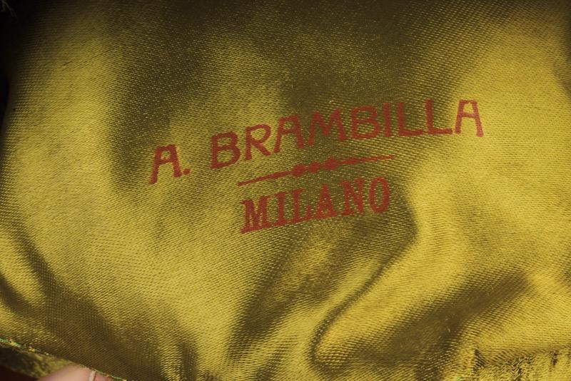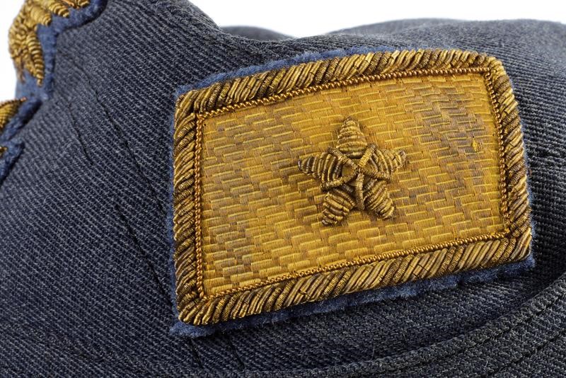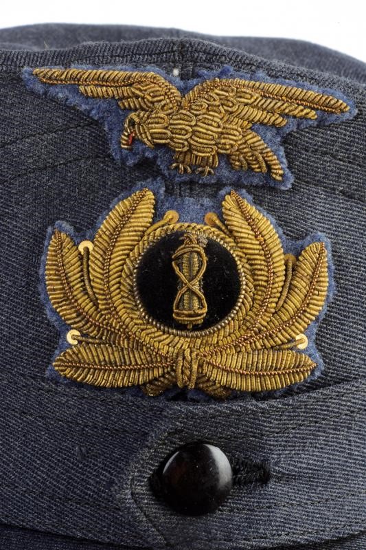 Confezionato in tessuto diagonale grigio azzurro, con raro fregio dell'areonautica repubblicana con fascio coevo su velluto nero; recante sul fianco distintivo in canutiglia dorata per un generale di brigata aerea. L'interno in materiale autarchico e con cuffia. In seta verde recante l'importante manifattura "A. BRAMBILLA MILANO".