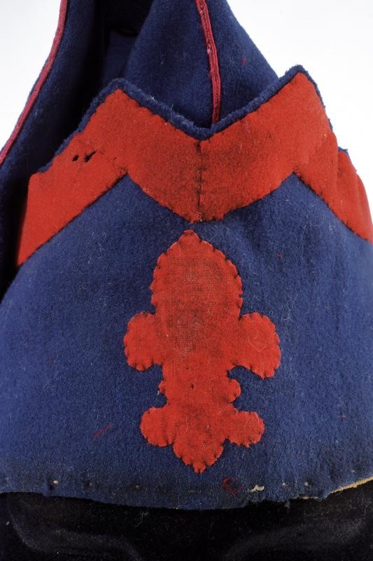 In panno azzurro con profilature rosse, fregio anteriore ricamato, effigiante un giglio di colore rosso; la sommità ripiegata sul lato destro, con nappina a base ricamata e di colore rosso. Segni d'uso e del tempo, alcune mancanze.