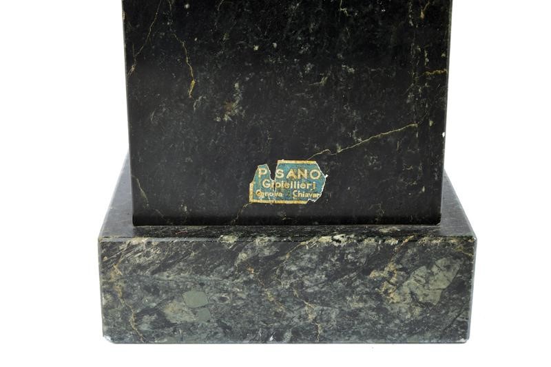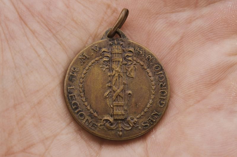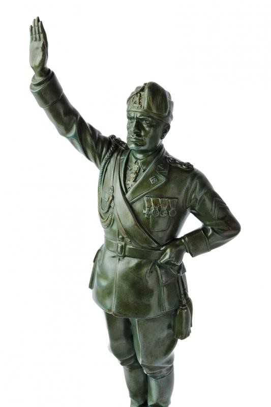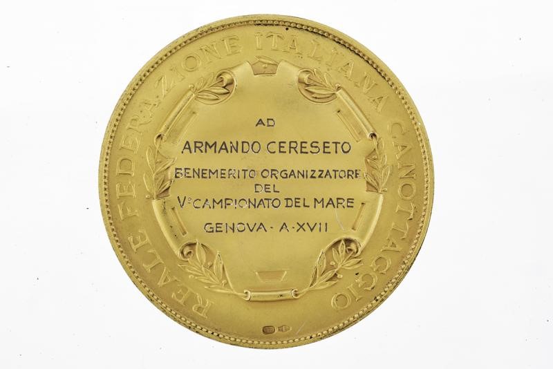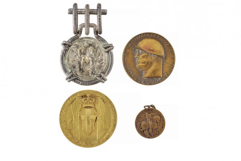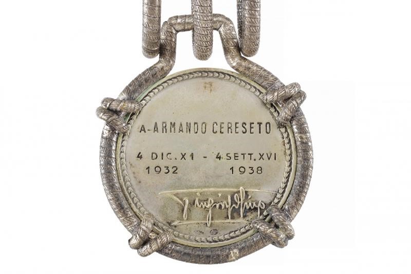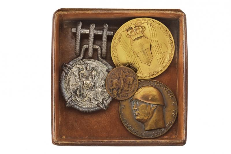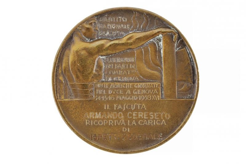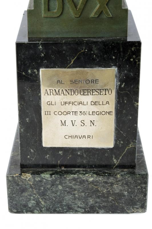 Tuttotondo in bronzo effigiante Benito Mussolini a figura intera nell'atto del saluto romano, in uniforme completa di fez, spalline, medaglie, dragona, stivali con speroni; la base a scalino con legenda "DVX"; la parte posteriore con firma dello scultore "CARLO PERLO". Basamento in marmo nero (piccola mancanza) con applicata frontalmente una targhetta in metallo bianco con la legenda "AL SENIORE ARMANDO CERESETO GLI UFFICIALI DELLA III COORTE 36a LEGIONE M.V.S.N. CHIAVARI"; nella parte posteriore etichetta "PISANO Gioiellieri Genova-Chiavari". Il lotto contiene anche quattro medaglie, tre delle quali nominative, una data dalla reale federazione italiana canottaggio in argento dorato, due punzoni; una con dicitura "Il fascismo genovese è un fascismo di fuoco", e le altre due raffiguranti San Giorgio che uccide il drago, una della 31° Legione San Giorgio della M.V.S.N; l'altra della milizia universitaria di Genova.