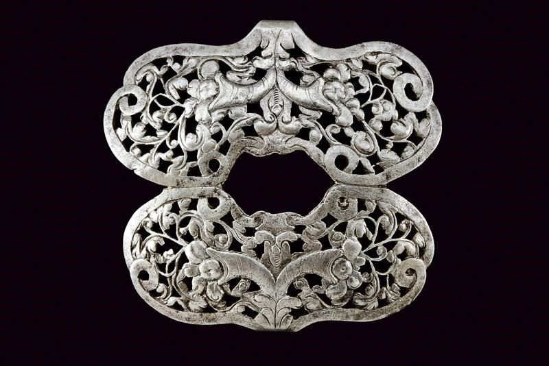 In ferro a due valve messe a giorno; quella anteriore leggermente più grande. Foro esagonale al centro; la superficie con fini incisioni ed intagli a motivi floreali, su ogni valva una coppia di cornucopie specchiate.