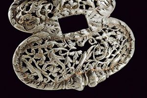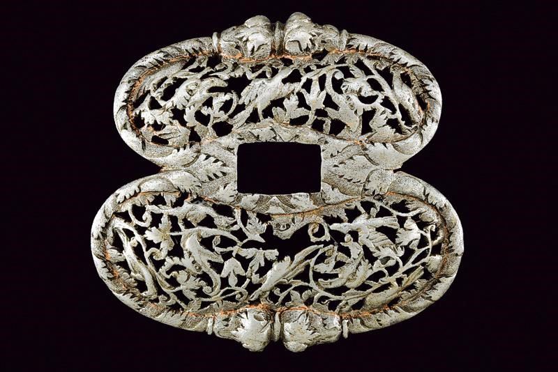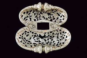 In ferro a doppia valva messa a giorno; quella anteriore leggermente più grande, con foro rettangolare al centro; la superficie esterna con finissimi intagli in bassorilievo raffiguranti motivi fitomorfi e al ai lati di ogni valva una testa di volatile (probabilmente un'aquila); ai bordi ingrossamenti a nodi.
