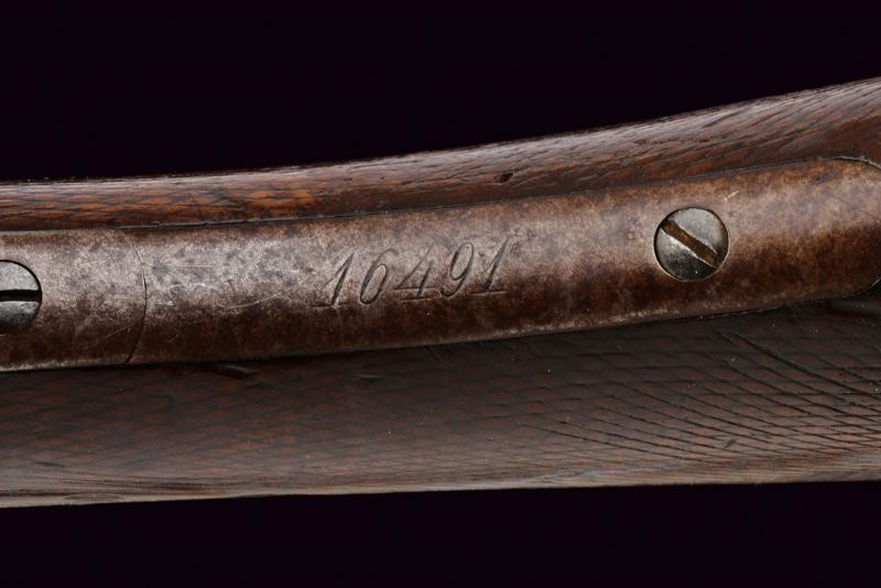 Canne tonde lisce da 30", in damasco (con qualche ammaccatura e anime con qualche segno d'uso e del tempo e intaccature), cal. 12. Bindella con mirino. Tracce di brunitura marrone antica. La bascula con lievi tracce di antica finitura. Batterie a molla in avanti firmate "Colt's Pt. F. A. Mfg. Co." Meccaniche ben funzionanti. Calcio ed astina in noce, entrambi con resti di zigrinatura. Codolo inferiore del ponticello con matr. "16xxx". Matricola coeva su canne, astina e bascula. Calciolo in ferro con lievi intaccature.