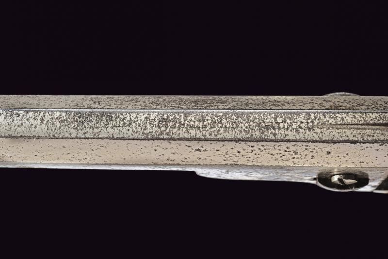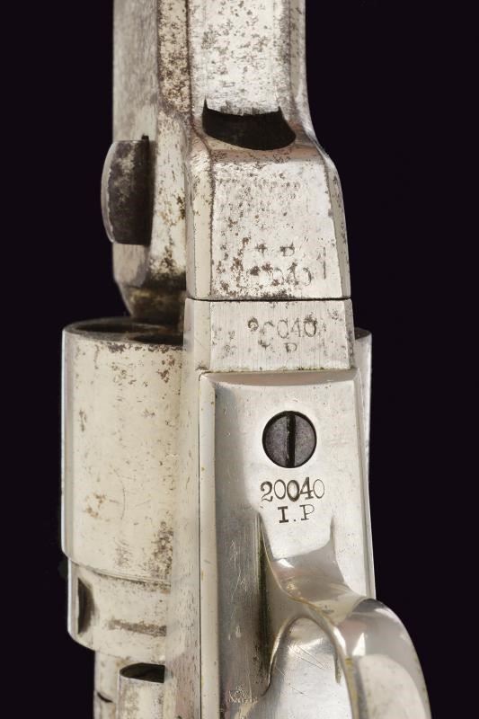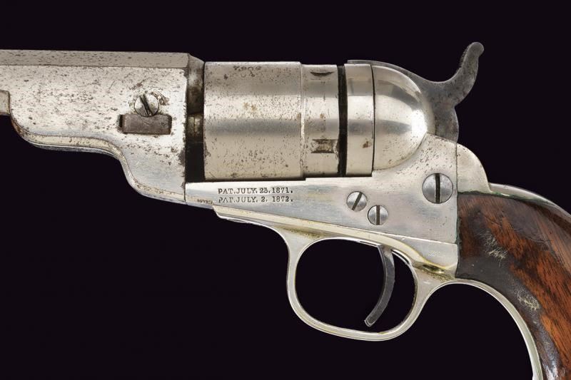 Canna ottagonale rigata da 4-1/2", con mirino, marcatura standard in una riga, scarsamente visibile. Calibro probabilmente 38 rimfire (9,7 mm. in volata). Anima pulita, rigatura visibile. Tamburo a cinque colpi, privo di incisioni. Meccanica ben funzionante. Il ponticello con marcatura "36 Cal." Impugnatura con bande in ottone. Matr. "200xx" su canna (scarsamente visibile), castello e bande dell'impugnatura, sul tamburo due matricole (tipico di questo modello) una coeva al resto dei componenti. Le parti punzonate anche "I.P" sul lato inferiore accanto ai numeri. Marcature dei brevetti del 1871 e 1872. Conserva buona parte (70% circa) della nichelatura, probabilmente antica. Guancette lisce in noce.