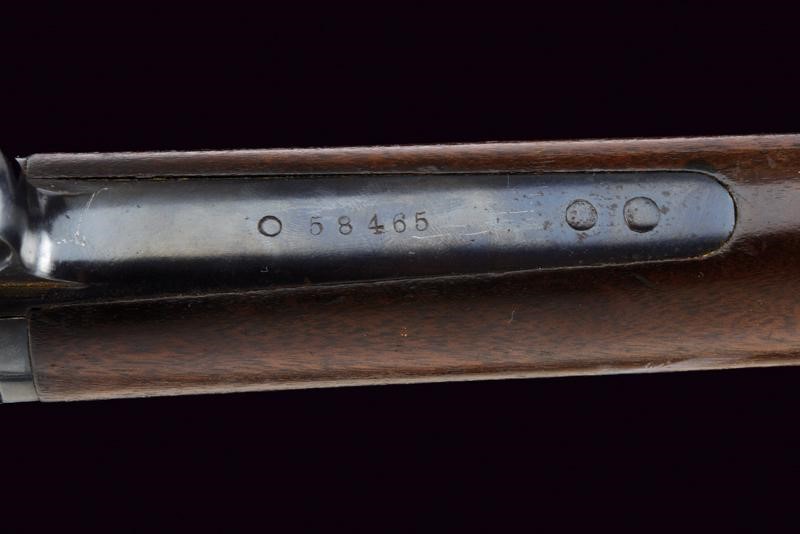 Canna tonda rigata da 20", marcata con indirizzo della ditta e con brevetti fino al 1887, dotata di mirino ed alzo abbattibile e regolabile, dicitura del calibro "44 Cal." Anima con rigatura visibile, intaccature e segni d'uso all'interno. Meccanica funzionante. Calcio ed astina in legno, la seconda zigrinata, il primo con lievissime mancanze al collo. Matricola nel codolo inferiore "58xxx". Senza anello da sella. Intaccature all'esterno del serbatoio tubulare. Ben ribrunita.