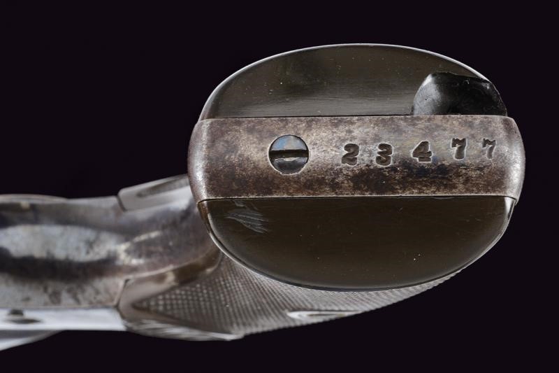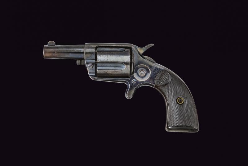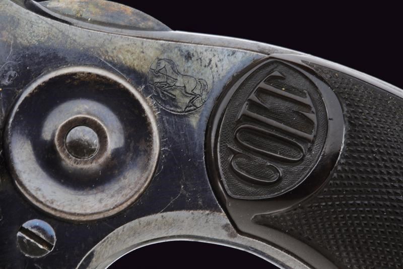 Canna tonda rigata con marcatura della ditta in due righe al dorso e "NEW HOUSE 38" sul fianco. Anima pulita, rigatura visibile. Tamburo scanalato a cinque colpi. Meccanica funzionante. Castello marcato con cavallino rampante. Bella brunitura color blu probabilmente antica conservata al 70% circa. Guancette in gommadura zigrinata con dicitura "COLT" in rilievo (una con mancanza sul fondo). Grilletto a sprone.