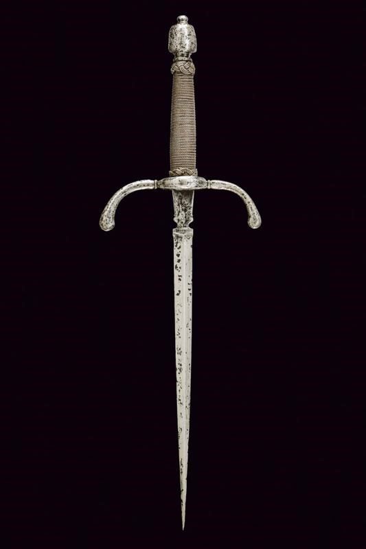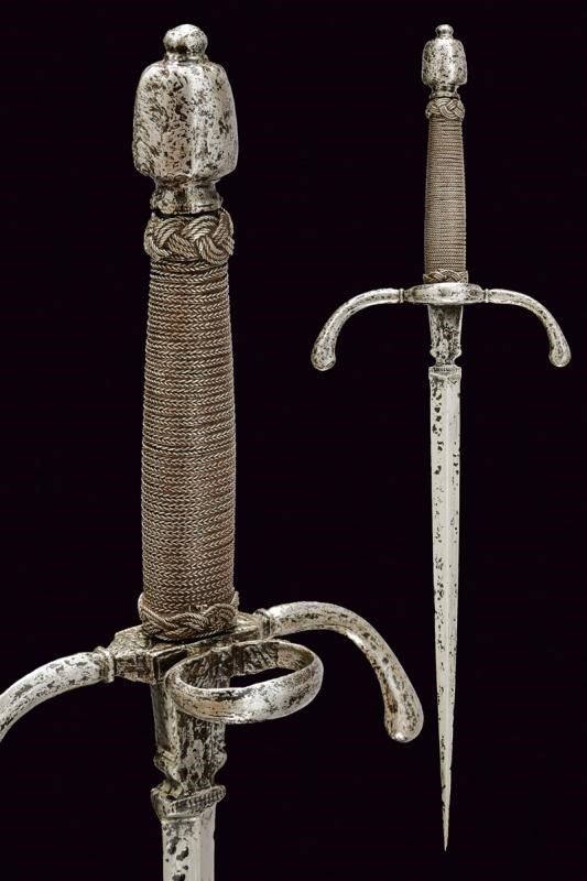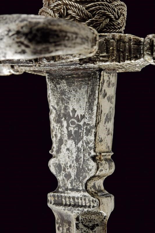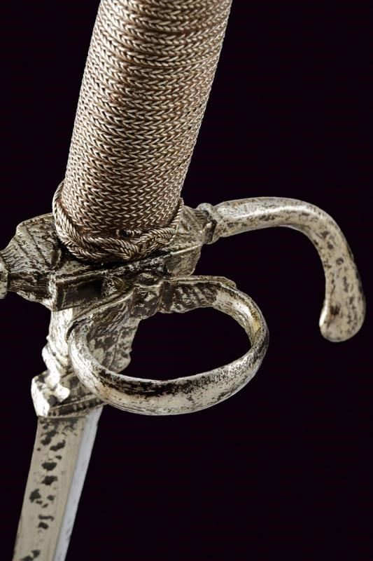 Lama dritta di sezione romboidale, a due fili, la base intagliata a vaso e con resti di punzone. Fornimento in ferro con bracci incurvati verso la lama e con estremità ingrossate. Anello di parata. Pomo a tino faccettato. Impugnatura in legno rivestita con trecciola e teste di moro in filo di ferro.
