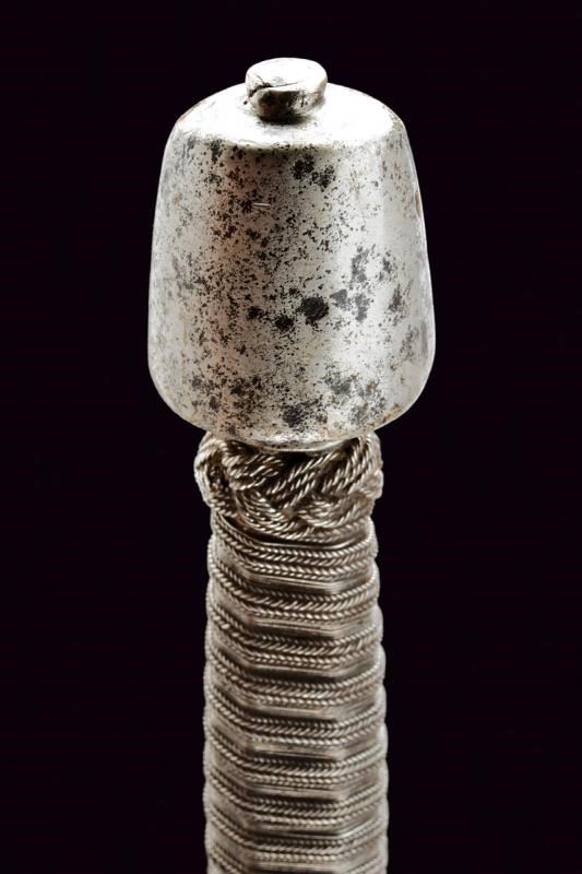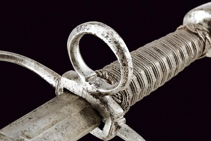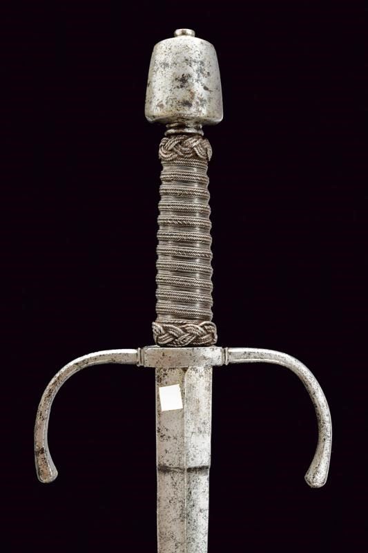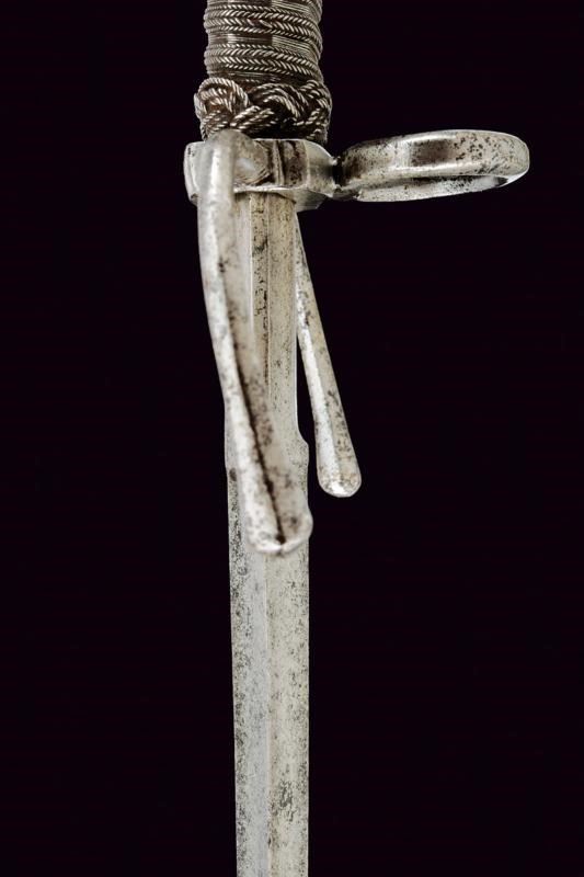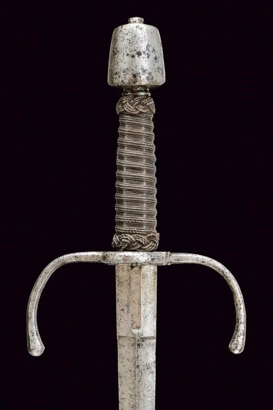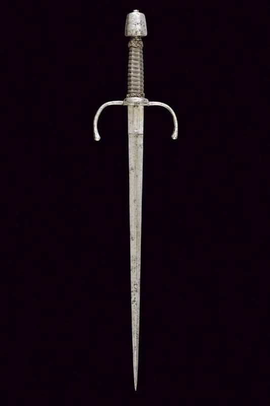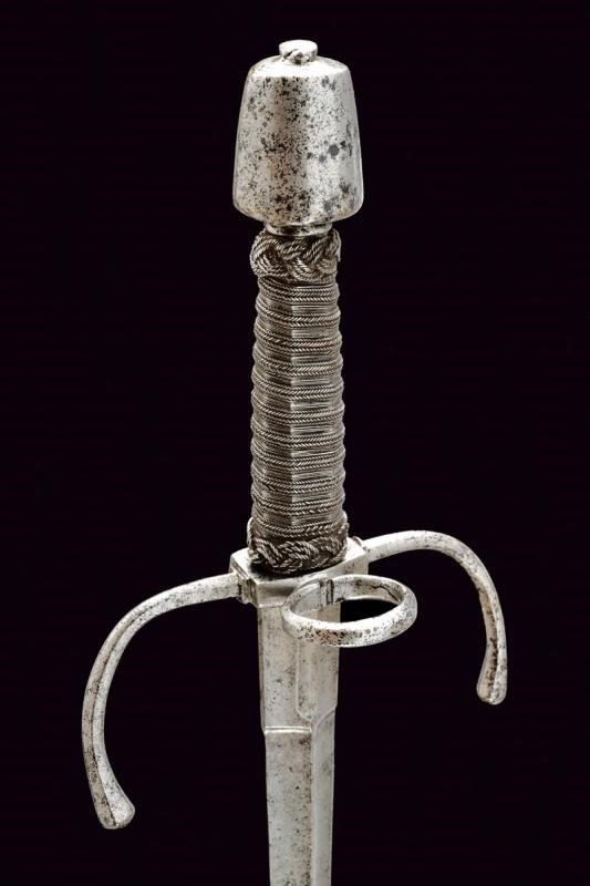 Robusta lama dritta a due fili, di sezione a losanga; il tallone con sguscio per il pollice su un lato, quello opposto costolato in mezzeria. Fornimento in ferro con bracci dell'elso faccettati, rivolti verso la lama e con estremità a pera. Anello di parata. Pomo di forma troncoconica con due lati lievemente angolati. Impugnatura in legno rivestita di trecciola e con teste di moro in filo di ferro.