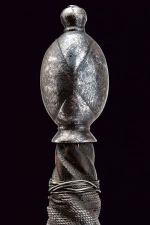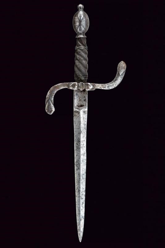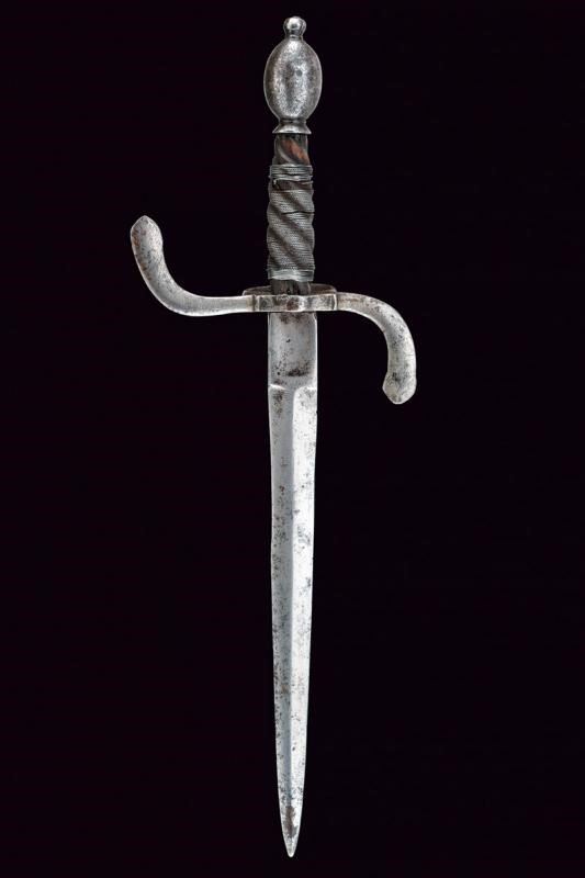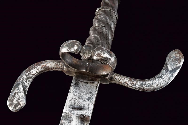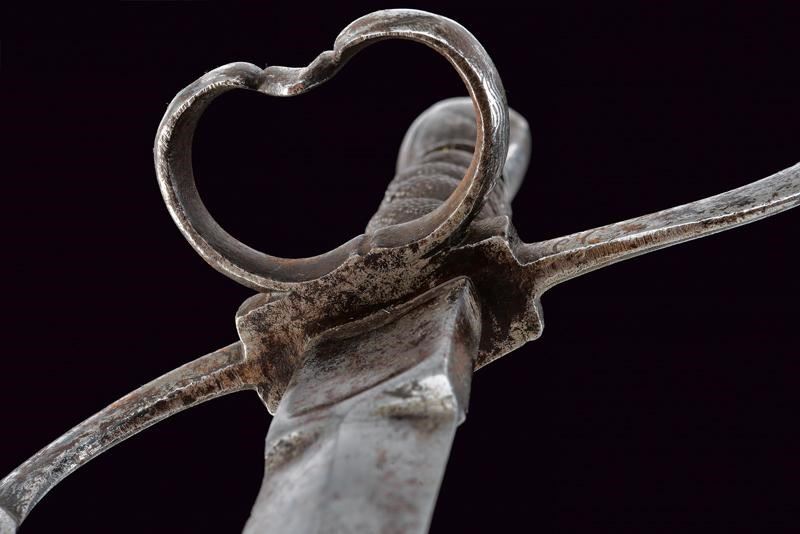 Lama dritta a due fili, costolata in mezzeria; tallone di forma rettangolare leggermente sgusciato. Fornimento in ferro con bracci controcurvati a "S", dotati di testa leggermente allargata ed ingrossata, la superficie con resti di incisioni ad emulare la pelliccia di un animale. Anello di parata leggermente schiacciato al centro e lavorato en suite con i bracci. Pomo ellittico inciso en suite e con bottone. Impugnatura in legno lavorata a spire, rivestita con trecciola metallica in filo di ferro (resti).