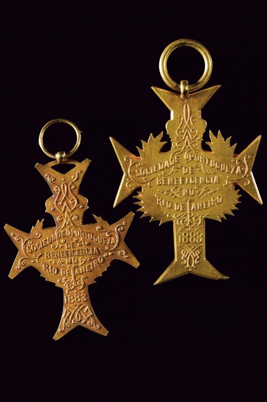 Due croci simili ma di taglia differente. In oro basso. Sul retro iscrizione "SOCIEDADE PORTUGUEZA DE BENEFICENCIA NO RIO DE JANEIRO 1883".