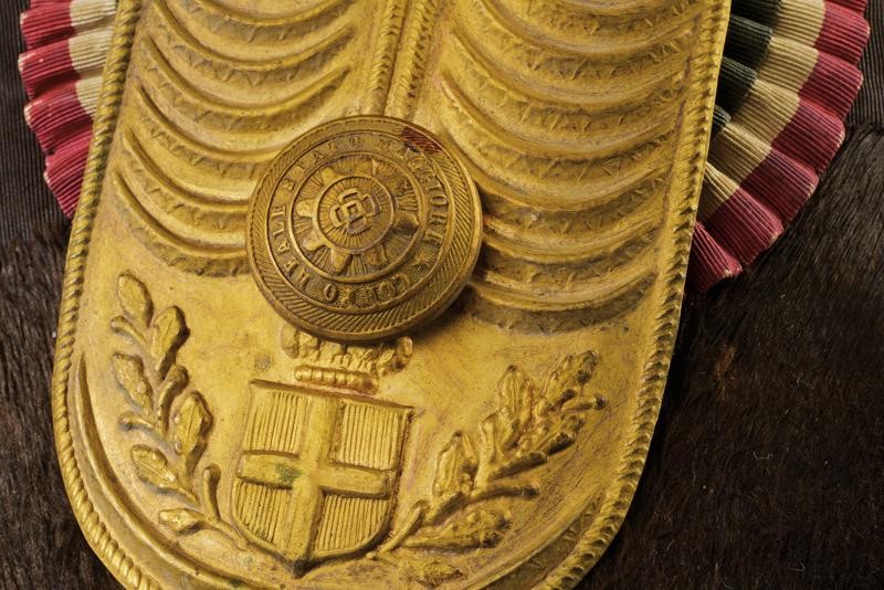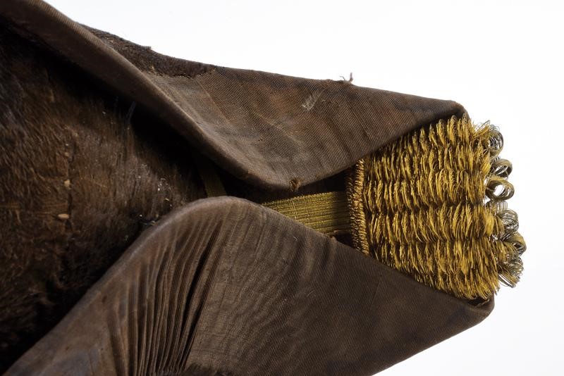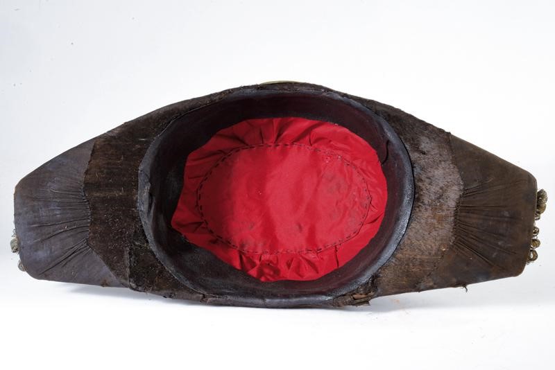 Struttura in galletta ricoperta da felpa nera ornata da tessuto marezzato, cappio e bottoni metallici caratteristici del corpo, i quali trattengono bella coccarda tricolore; alle punte voluminosi maccheroni in groviglio dorati. Semplice interno in seta rossa (segni d'uso e del tempo); alluda in pelle nera.