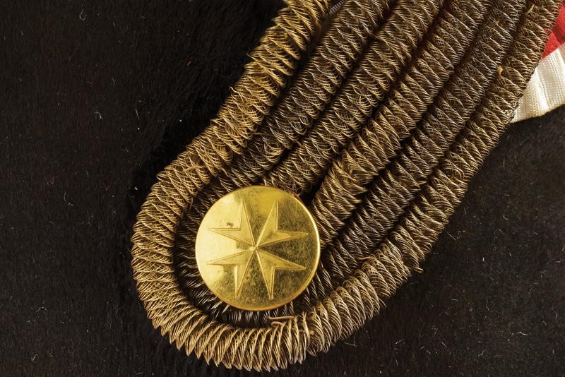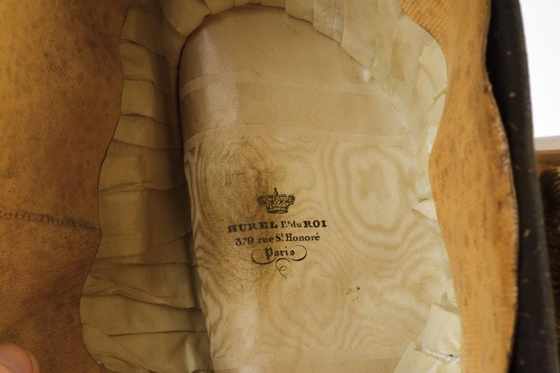 Struttura in feltro castorato, ornata da abbondanti piume bianche, ganza tubolare a sei ordini che trattiene una bella coccarda semi-rigida nei colori del corpo. Alle punte maccheroni dorati in duplice ordine. L'interno con ampia alluda in pelle chiara con cuffia in seta bianca recante una manifattura parigina.