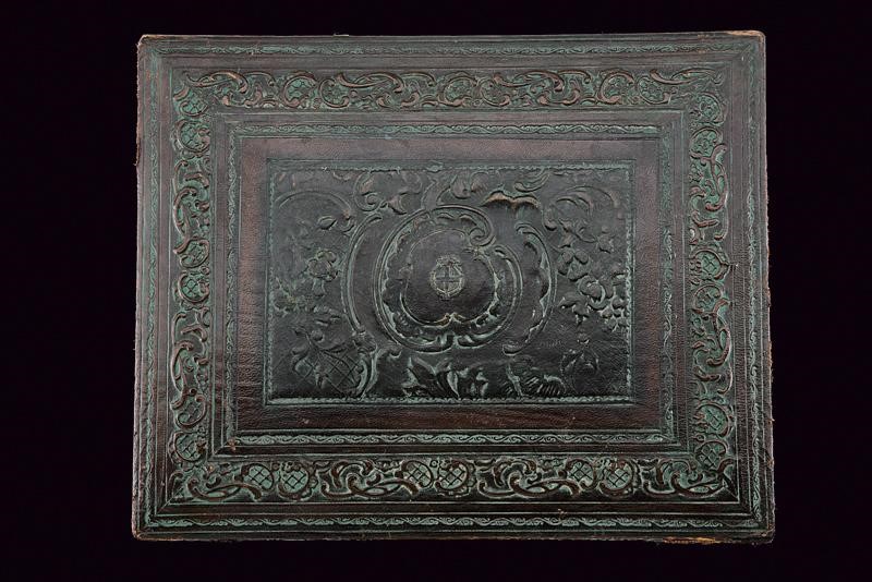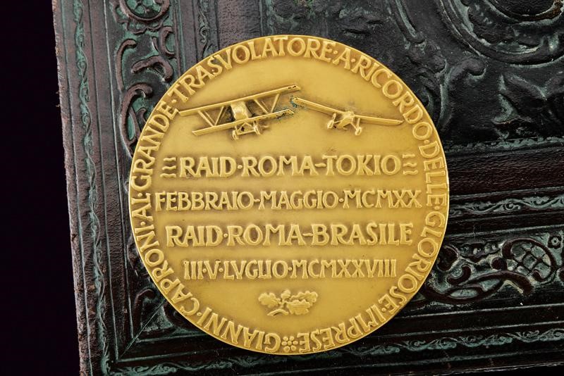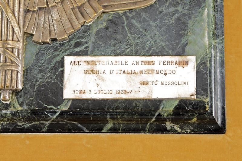 Targa in marmo verde con venature bianche con bordi modanati; applicazione in bronzo dorato raffigurante un fascio littorio dal quale parte un'ala con legenda "PER LE ALI D'ITALIA"; nella parte bassa a destra placca con la dedica "ALL'INSUPERABILE ARTURO FERRARIN GLORIA D'ITALIA NEL MONDO - BENITO MUSSOLINI - ROMA 3 LUGLIO 1928 V". Il retro con mancanza e fodera in tessuto verde. La targa è costudita in un astuccio ricoperto in pelle (piccoli difetti) ornato con impressioni, l'interno in velluto e seta, nel coperchio marcatura in oro "Lorioli & Castelli Via Bronzetti N. 26 Milano". Insieme ad una medaglia in bronzo dorato commemorativa delle nozze fra Arturo Ferrarin e Adelaide Castiglioni offerta da Gianni Caproni (11 giugno del 1931).
