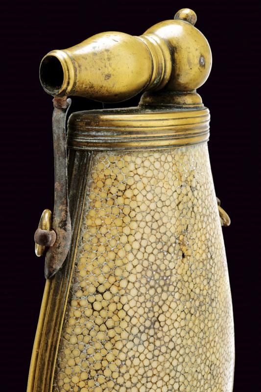 Corpo in legno rivestito con pelle di razza. Cannello pieghevole e cornice in ottone. Due anelli di sospensione.