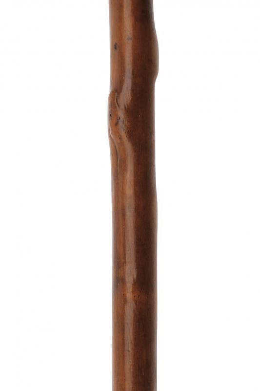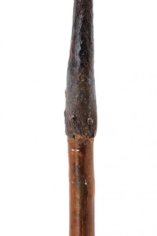 In ferro con gorbia in ottone, fusto ligneo, la base in ferro appuntita e con gancio a "U".