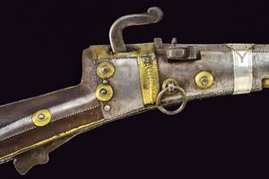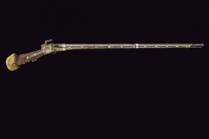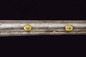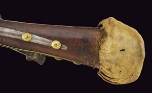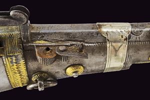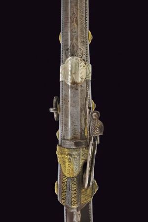 Lunga e pesante canna liscia di sezione ottagonale, in damasco, con alzo alla base e marca araba, la volata con mirino e in cal. 15.8 mm. Lo scodellino con copriscodellino girevole, meccanismo interno funzionante. Calcio in legno, l'astina completamente rivestita sino allo scodellino con in lamina di ferro a bordo dentato, parzialmente incisa e munita di rivetti foderati in ottone. Grande pomo rivestito di cuoio. Bacchetta in ferro. Anello da sella.