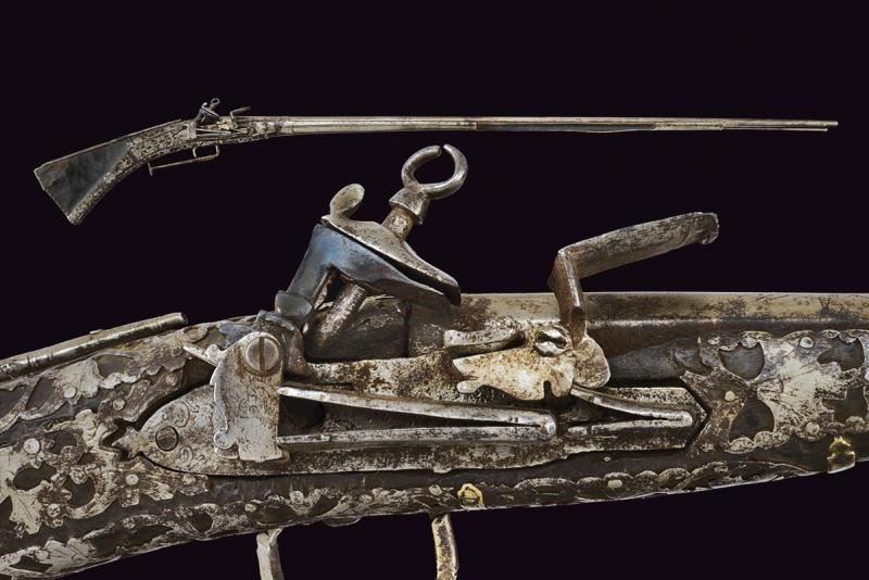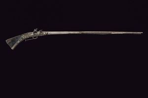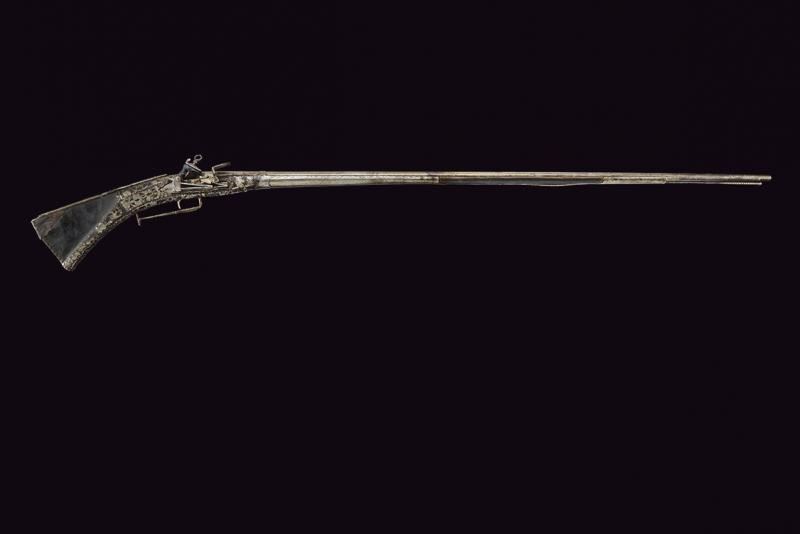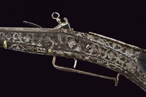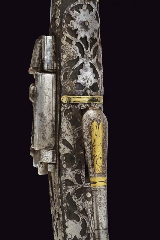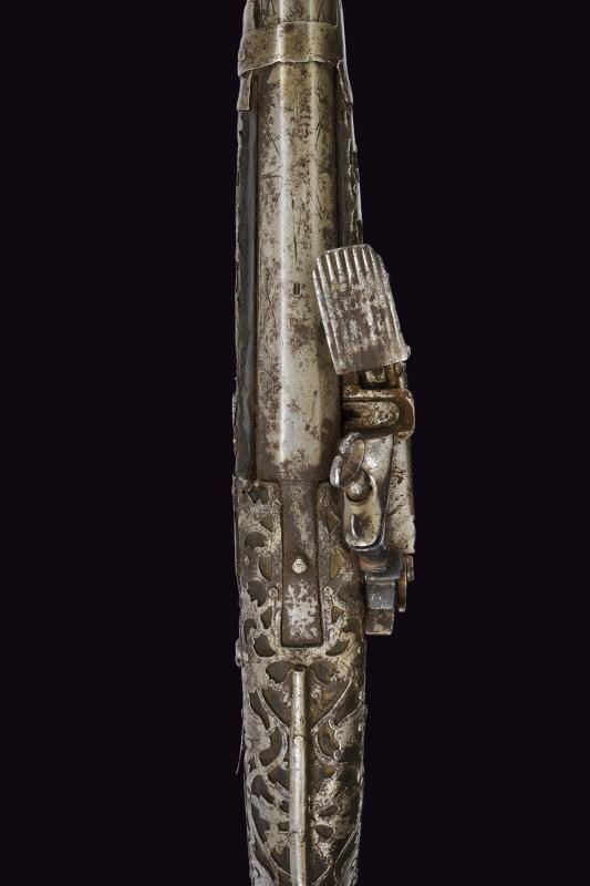 Lunga canna liscia, di sezione ottagonale con volata circolare, recante resti di incisioni alla base; cal. 10.5 mm. Batteria a pietra focaia alla micheletta. Cassa in legno (piccole mancanze e restauro alla pala) parzialmente ricoperta con placche in ferro, quelle del calcio riccamente incise e traforate a motivi floreali, piccole mancanze. Ponticello in ferro con decorazioni in ottone. Bacchetta in ferro con estremo decorato a nodi.