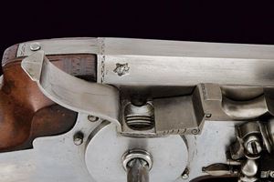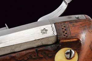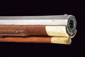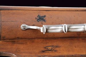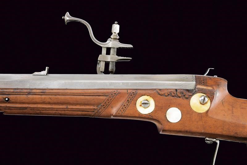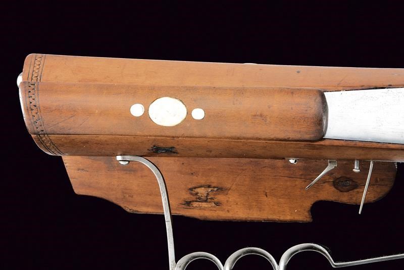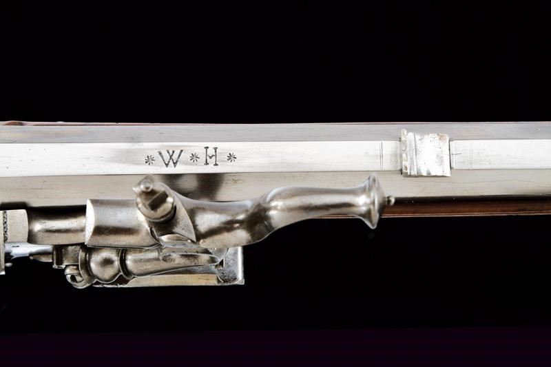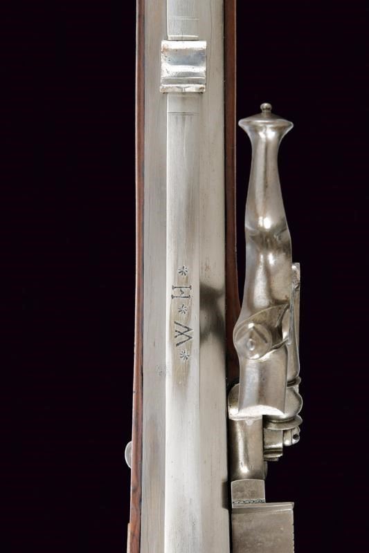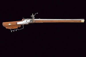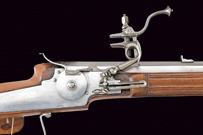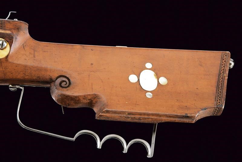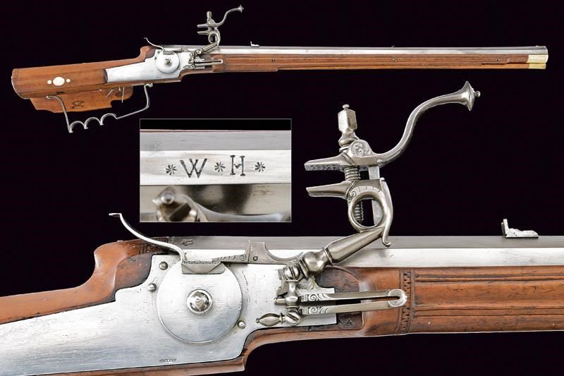 Canna ottagonale, rigata (anima pulita, rigatura ben visibile), recante cornice incisa in culatta, munita di due punzoni e marcata con le lettere"W M" alternate a stelle; alzo fisso in ferro e mirino in ottone, la volata lievemente strombata e con cornice, cal. 14 mm. Codetta con cornice. Batteria a ruota con cartella piatta e ruota coperta; molla, cane, scodellino e copriscodellino con incisioni floreali. Cassa intera in legno decorata con nervature e bande che riprendono la fantasia delle cornici sulla canna; il calcio con tarsie in madreperla e osso, recante sul lato inferiore un punzone a fuoco effigiante due pesci speculari ed il numero d'inventario "5". Muso in osso. Ponticello anatomico in ferro. Stecher. Bacchetta in legno con battipalla in osso e base in ferro.