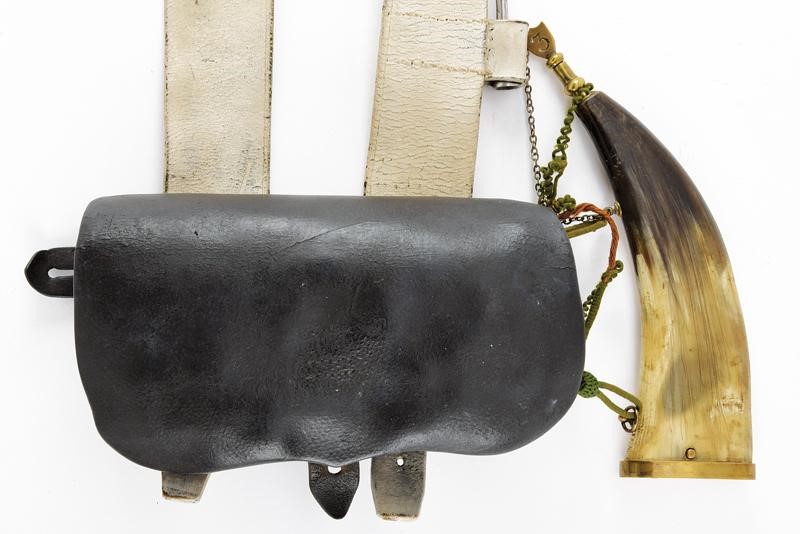 Giberna in cuoio nero con secondo serbatoio laterale. Tracolla in cuoio bianco munita di bacchetta in ferro per pistola avancarica Lorenz mod. 1850. Insieme con la fiasca da polvere in corno di mucca con fornimenti in ottone (il tappo con numero di compagnia "3"). Resti di cordatura. Tutto materiale dell'esercito imperiale austriaco.