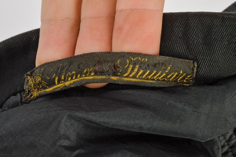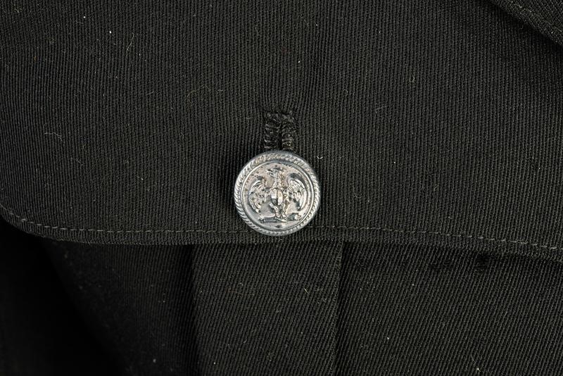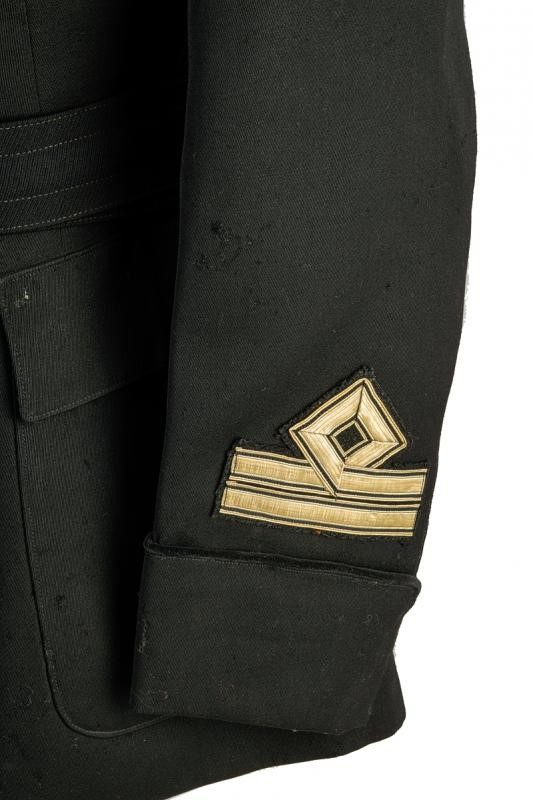 Confezionata in gabardine di lana nera; fiamme al bavero in velluto di seta caricato di fascio in metallo argentato, una delle due controspalline in metallo argentato brunito, gradi alle maniche in lastra d'argento bordata nera. Rara.