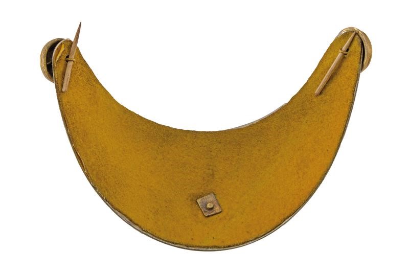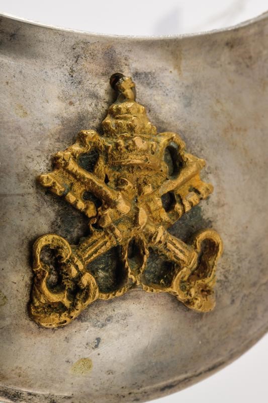 Grande piatto in argento, recante al centro il fregio in metallo dorato effigiante chiavi decussate sormontate da tiara, grandi bottoni in metallo dorato, il retro foderato in tessuto giallo. Rara.
