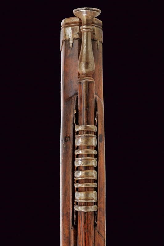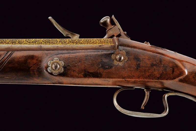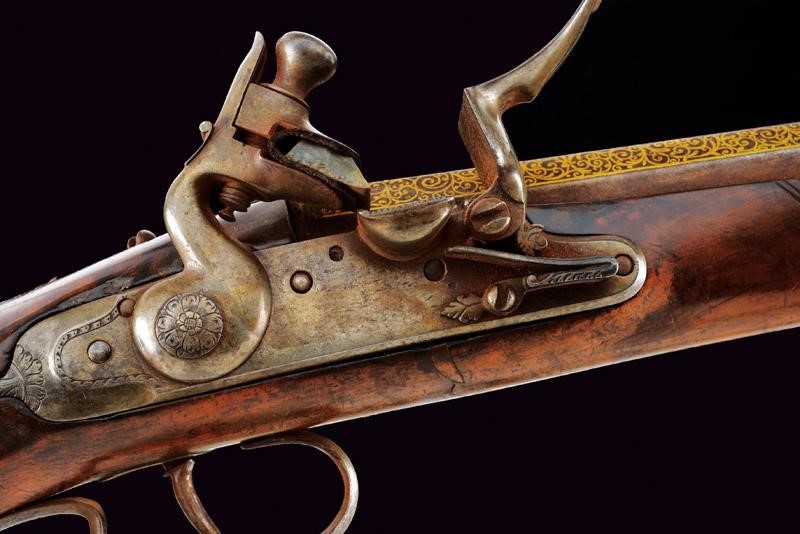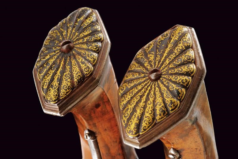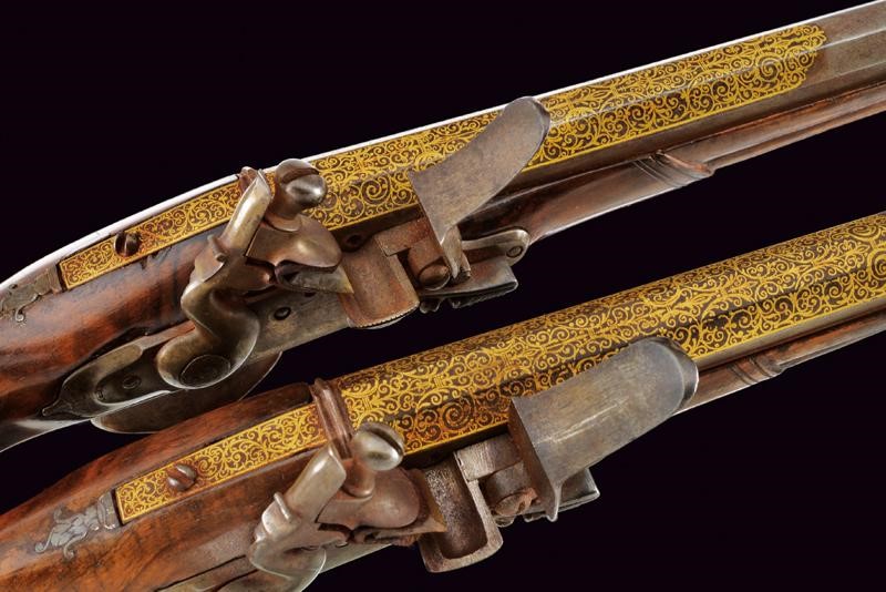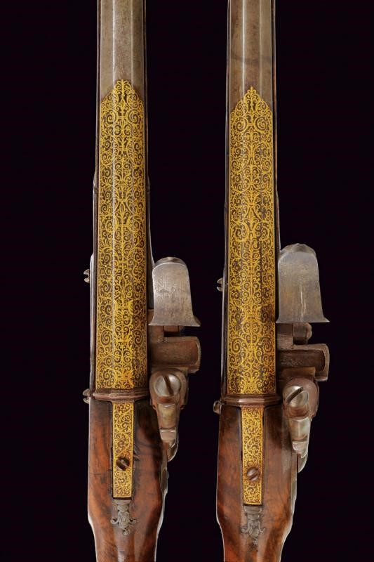 Lunghe canne lisce, ottagonali, con cornice alla base, ageminate a finissime arabesche in oro nella prima parte e alla codetta, cal. 15 mm; batterie a cartella piatta con coda ribassata ed incisa, firmate all'interno "Jean Picot"; eleganti casse in radica (qualche restauro) con calcio faccettato, cocce in ferro di forma ottagonale con contropiastra scanalata ed ageminata en suite in oro, ponticelli in ferro leggermente inciso a fiorame; bacchette in legno con battipalla in ferro.