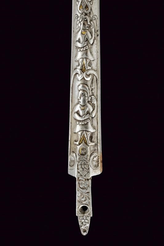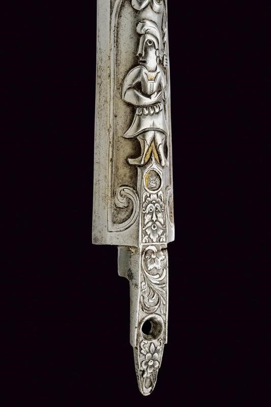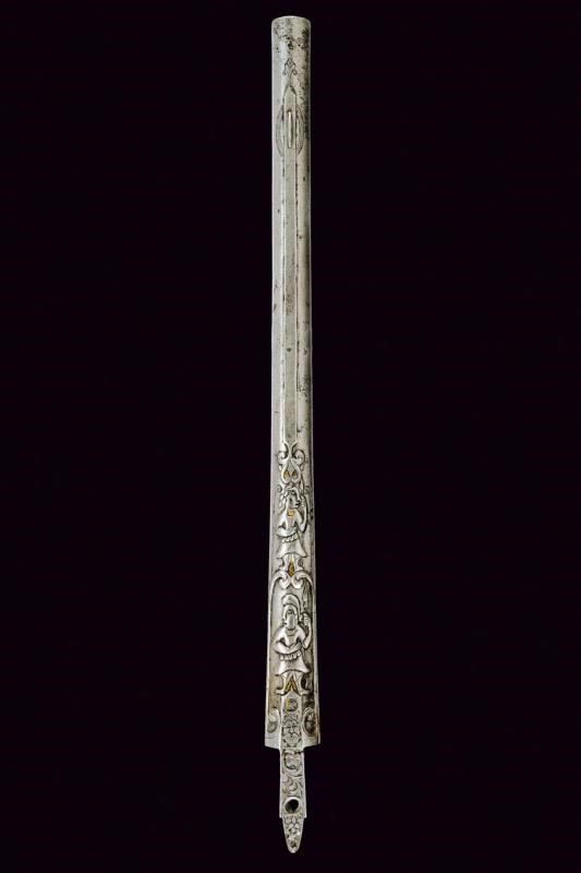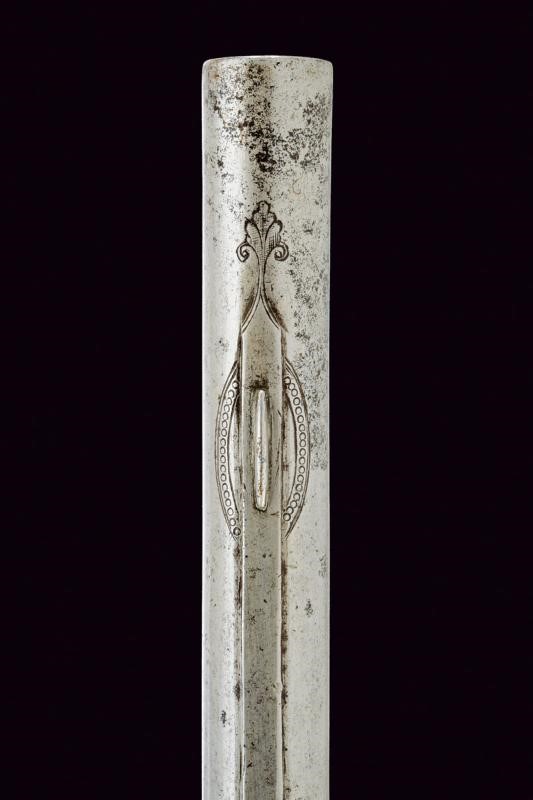 Di sezione tonda e di anima liscia, per più di un terzo decorato con finissime incisioni ed intagli, la base con cornice affiancata da riccioli contenente mascherone sormontato da un punzone ovale, seguono due belle raffigurazioni di guerrieri all'antica, entrambi provvisti di lancia, uno con elmo, tipico gusto di poemi antichi, alcuni elementi con resti di doratura; più avanti una bindella che culmina in un mirino fra incisioni a motivi geometriche e floreali. Codetta impreziosita da belle incisioni di fiori. Rara.