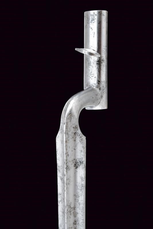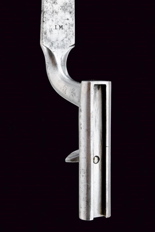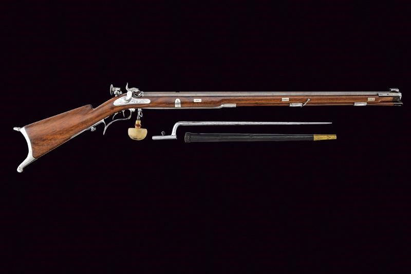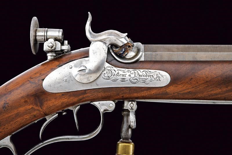 Pesante canna ottagonale rigata (anima con leggero pitting, rigatura ben visibile) brunita, con punzone "C" entro uno scudetto alla base, spazio per un'alzo (probabilmente rimosso impiegare l'arma con una diottra, inclusa) mirino di precisione a tunnel, attacco per la baionetta, cal. 16 in volata. Lunga codetta munita di diottra. Batteria a molla in avanti con firma "Pasteur a Yverdon" tra volute. Cassa intera in legno con fornimenti in acciaio. Il pomo d'appoggio in legno, con gamba in ferro, conserva ancora il rivestimento originale di cuoio. Meccanica con stecher, funzionante. Bacchetta in legno con battipalla in corno e base in ottone. Con la sua baionetta in ferro munita di fodero in cuoio con puntale in ottone.
