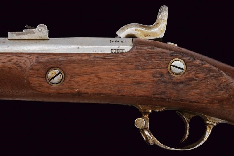 Canna tonda rigata (anima pulita, rigatura visibile) da 40", dotata di mirino, alzo regolabile in tre altezze con fogliette abbattibili, culatta ottagonale, con marchi "V" e "P" sormontanti la testa d'aquila, timbro "STEEL", data "1863". Cal. 58 (14,8 mm in volata). La base del pistone con aquila statunitense. Batteria con marcatura completa della ditta e data "1863". Meccanica funzionante. Cassa intera in noce con timbri d'ispezione militare sul lato sinistro e resti di altri marchi sulla pala. Fornimenti in ferro. Calciolo marcato "US". Tre fascette punzonate "U". Bacchetta in ferro. Qualche lieve intaccatura e segno d'uso alle superfici esterne in ferro.