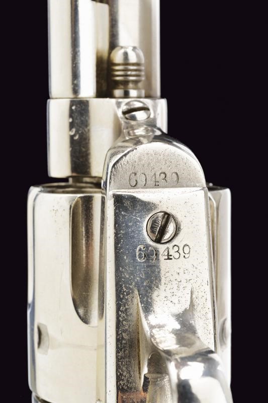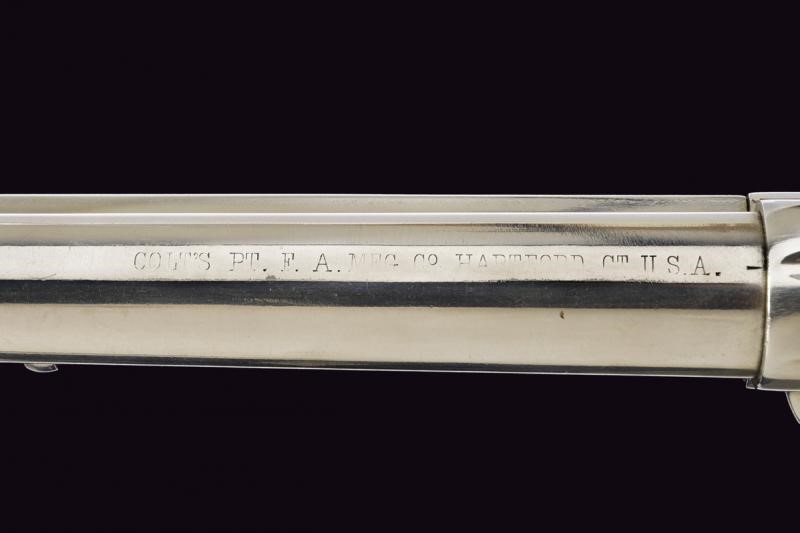 Canna tonda rigata da 7-1/2". Marcatura "COLT PT. F. A. MFG. Co. HARTFORD CT. U.S.A." ancora discretamente visibile. Anima pulita, rigatura visibile, segni d'uso e del tempo all'interno. Cal. 45 Colt. Tamburo a sei colpi. Meccanica funzionante. Quattro scatti. Sicura al grilletto funzionante. Castello con brevetti dal 1871 al 1875 ben visibili. Resti di dicitura del calibro al ponticello "45 Cal." (solo parzialmente leggibile). Matricola "69xxx" coeva presente alla base del castello, su ponticello e impugnatura. Sportellino con numerazione differente (4398 probabilmente numeri d'assemblaggio). Impugnatura in noce con un paio di tasselli riattaccati. Bella finitura nichelata probabilmente eseguita successivamente ma comunque ben realizzata. Sul fondo dell'impugnatura anello porta correggiolo.