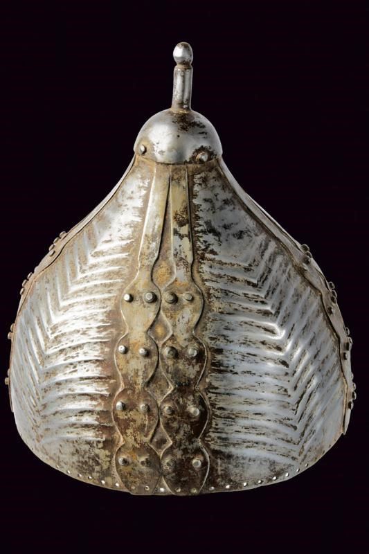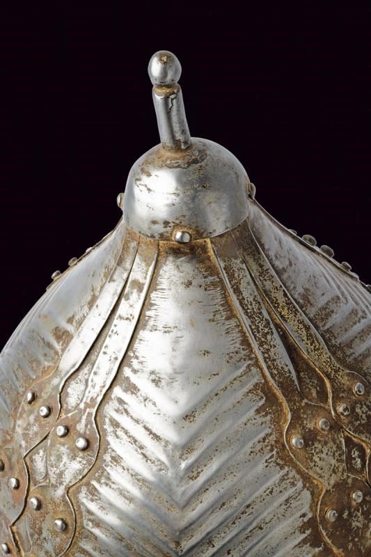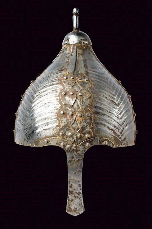 In ferro, con grande coppo decorato ad ali in bassorilievo; la sommità con piccola cupola rivettata doata di breve cuspide cilindrica che termina in una sfera. La parte anteriore con nasale, i quattro lati con doppie bande rivettate. La base con fori per un camaglio. XIX secolo o antecedente.