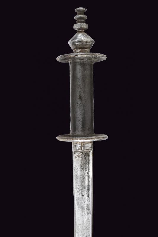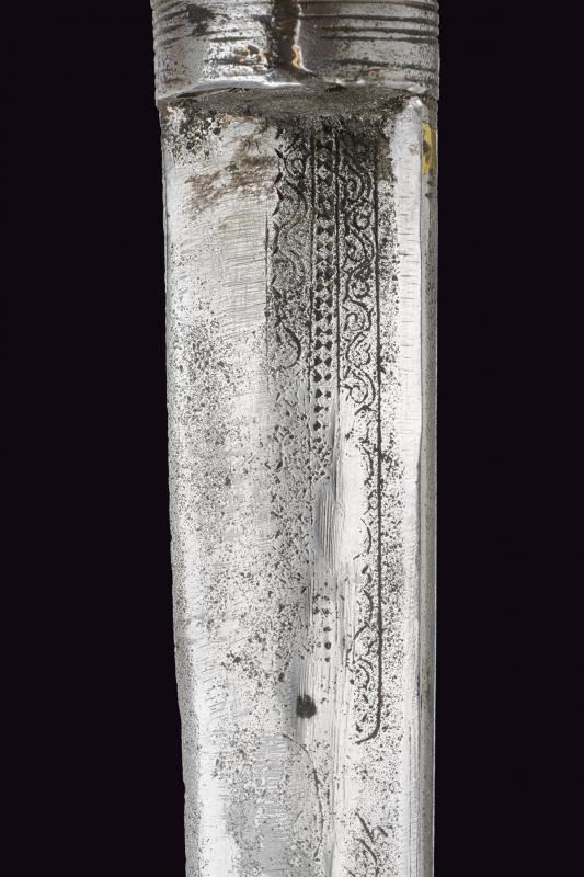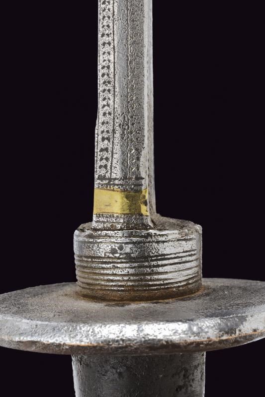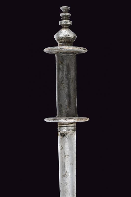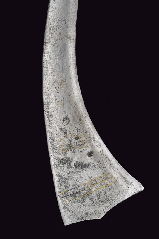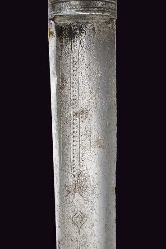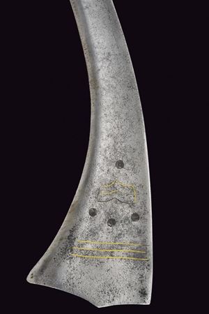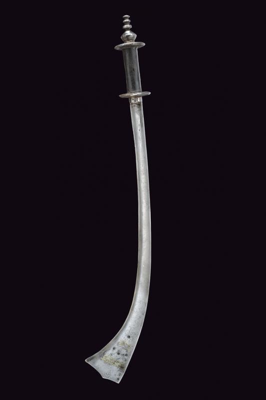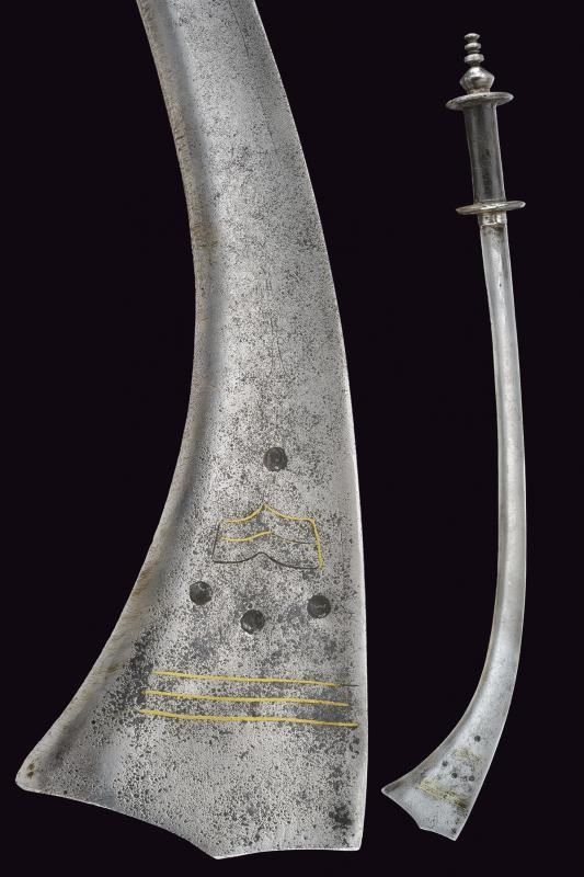 Lama curva a un filo, con punta palmata e leggermente ingrossata al dorso, recante al forte resti di incisioni a motivi geometrici e decorazioni rimesse in ottone (mancanze) al debole; fornimento in ferro a dischi, il pomo dotato di un lungo bottone a nodi. Rara.