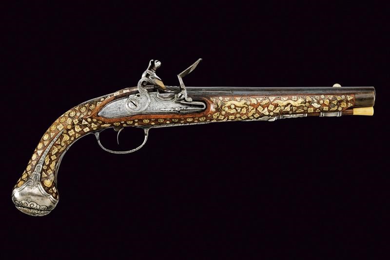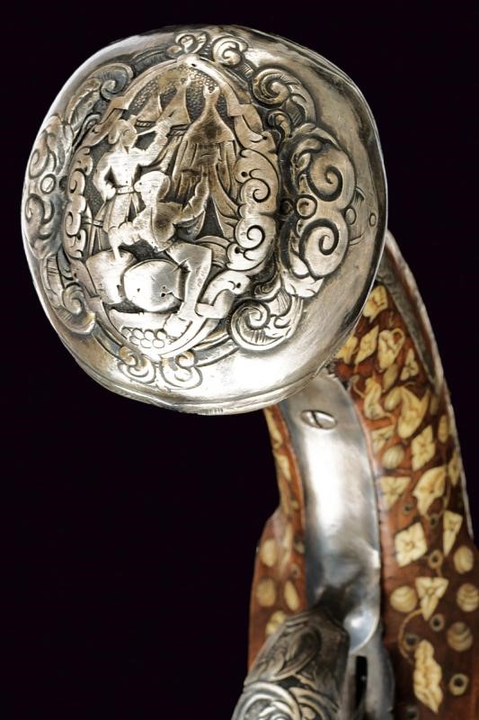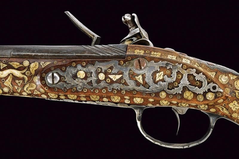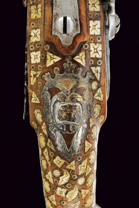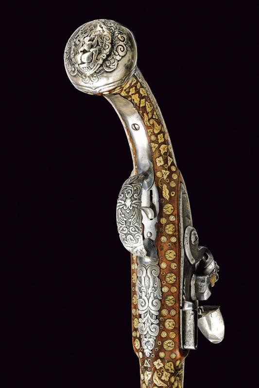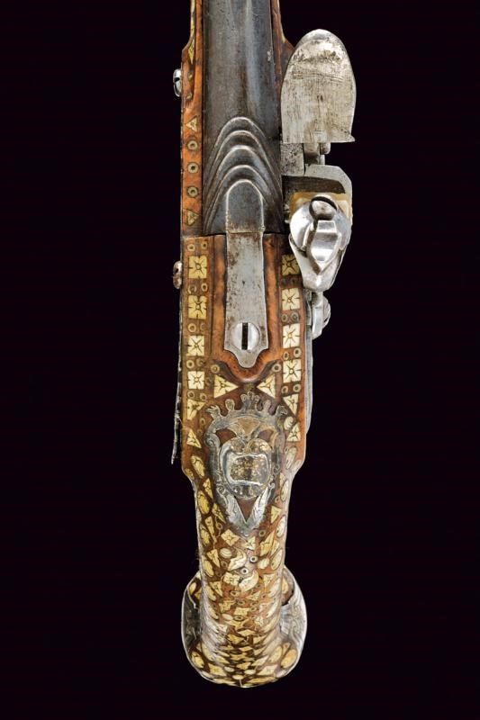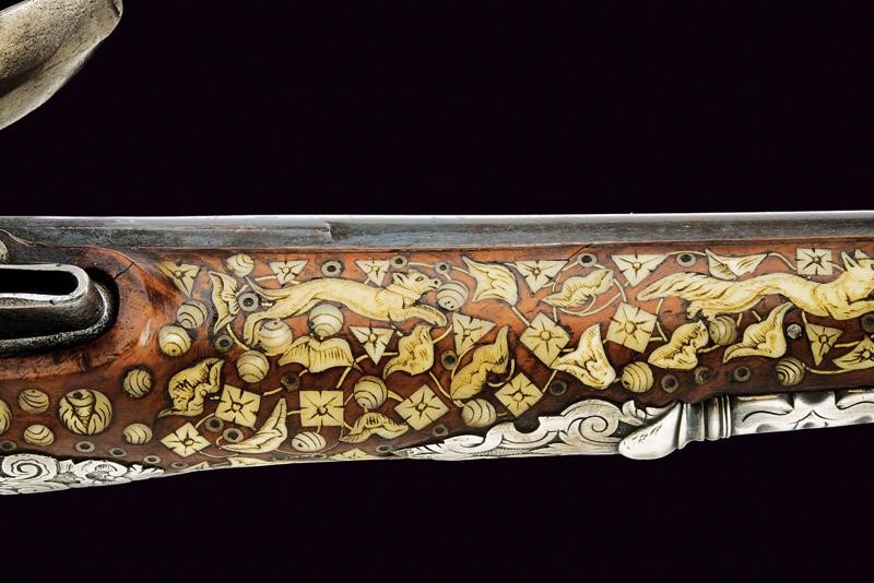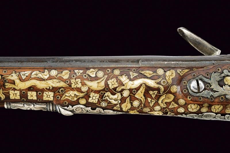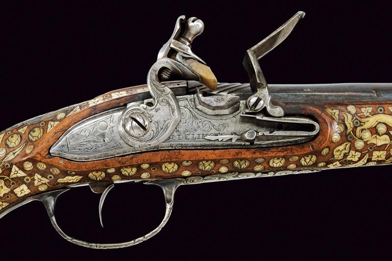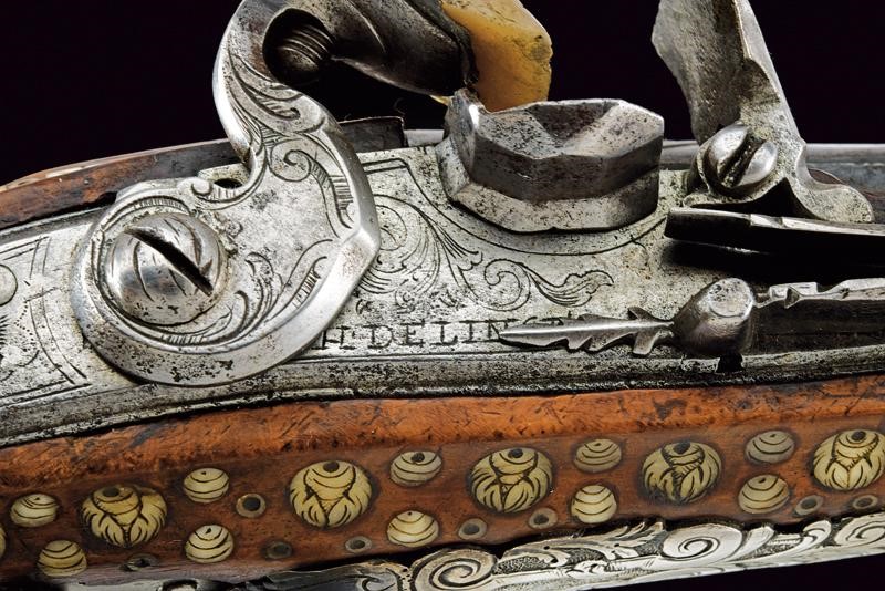 Canna liscia, brunita, recante intagli a scalini/onde alla culatta, munita di bindella recante mirino in argento; cal. 15 mm. Batteria con cartella piatta e bordi obliqui, incisa a motivi floreali e firmata "H. DELINCE". Cassa intera in noce, completamente intarsiata con piccole placche in osso incise a motivi floreali; sotto alla canna effigianti anche un cane che insegue una volpe. Bocchino in corno; fornimenti argentati e incisi, la contropiastra traforata (manca la vite anteriore), la coccia con raffigurazione di un accampamento di soldati; bacchetta in legno con battipalla in osso.