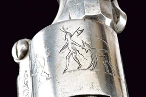 Canna lisca, ottagonale, marcata sulla lato sinistro "MANGEOT & COMBLAIN BREVETE" e con punzone "U" sotto corona; dotata di tacca di mira e mirino; cal. 9 mm. Tamburo a sei colpi, impreziosito da incisioni con iconografia del diavolo; punzone del banco di prova di Liegi e "U". Castello in ferro con incisioni a volute; nella parte sinistra è presente una sicura a vite che facendo scendere leggermente in cane blocca la rotazione del tamburo. Calcio in legno. Ponticello decorato en suite al castello e coccia munita di anello di sospensione. Meccanica funzionante.