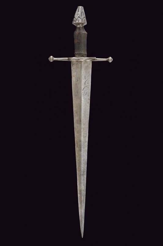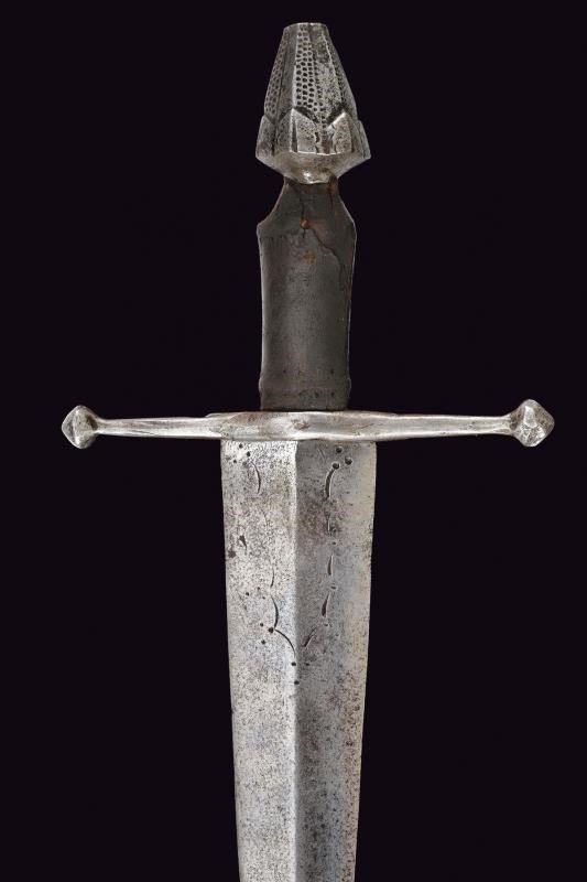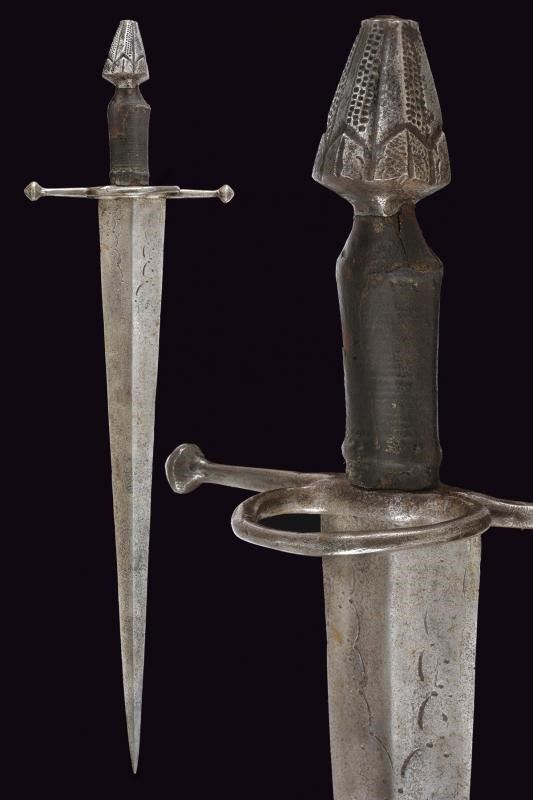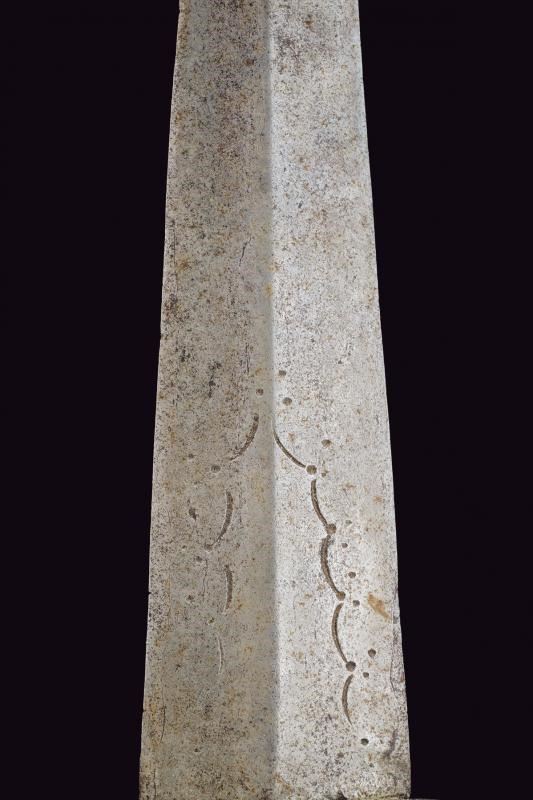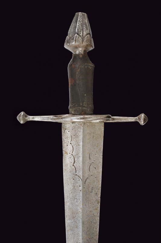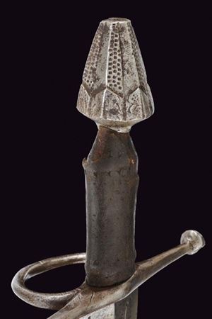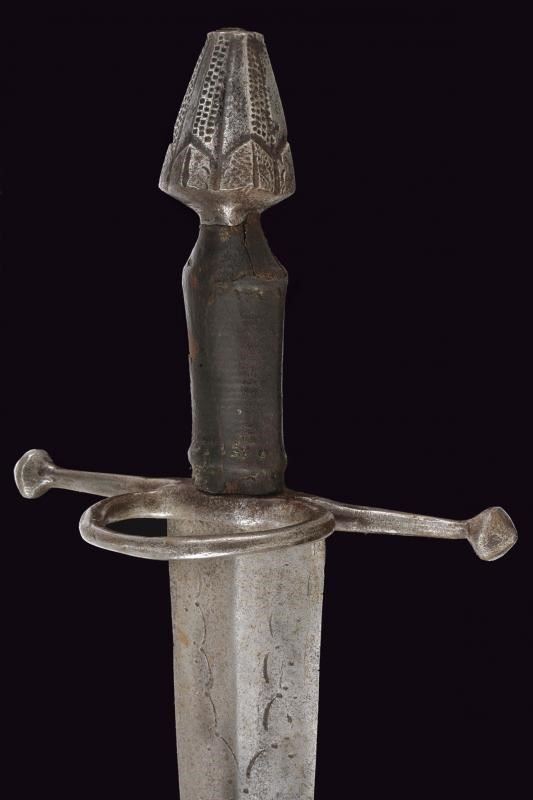 Lama triangolare derivata molto probabilmente da uno spiedo, incisa alla base a onde e puntini. Fornimento in ferro con bracci dell'elso dritti con estremità a bottone e largo anello di parata. Pomo troncoconico, faccettato ed inciso a motivi geometrici. Impugnatura in legno rivestito di cuoio originale (mancanze).