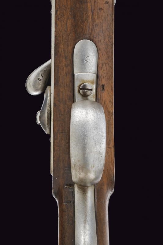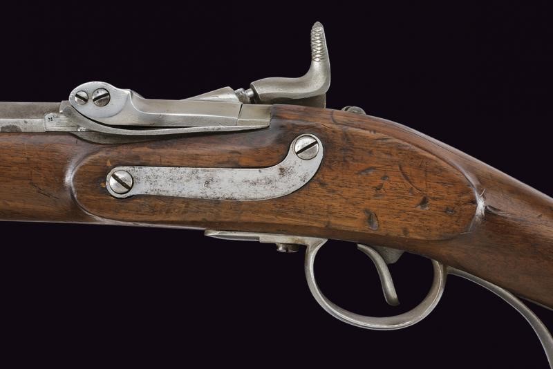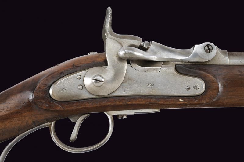 Canna rigata, ottagonale con volata tonda, marcata "LW", "13631", "69", "W", "K" e con due punzoni imperiali, dotata di alzo regolabile, mirino e dente d'innesto per la baionetta, cal. 13.9 mm. Otturatore ribaltabile, codetta con resti di marcatura "LRENTZ" e punzone "N"; batteria a molla in avanti datata "860". Cassa intera in legno. Fornimenti e bacchetta in ferro. Meccanica funzionante.