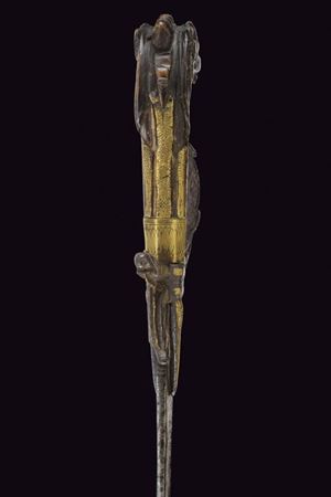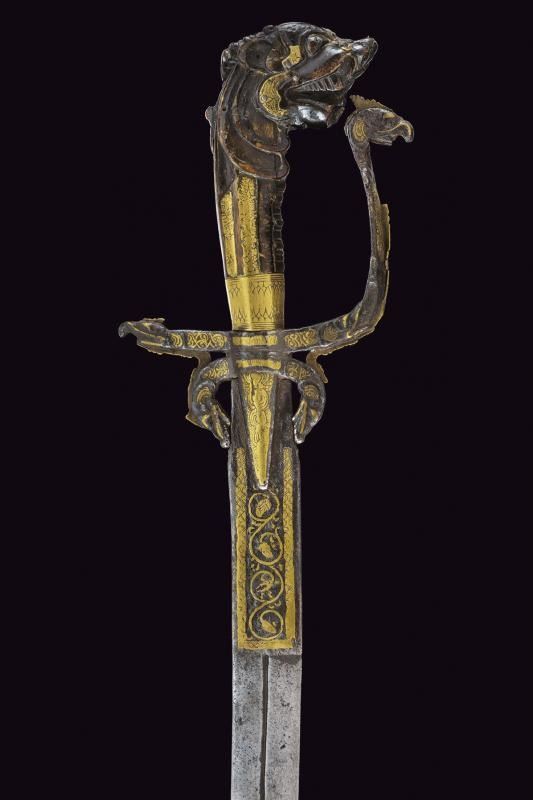 Lama curva a un filo, recante alla base scanalatura centrale, dotata di lungo tallone decorato in ottone ed inciso a motivi floreali entro una cornice. Fornimento in ferro con lunghe alette triangolari; archi, braccio dell'elso e ramo di guardia terminanti a testa di drago, tutti gli elementi parzialmente in ottone. Impugnatura in corno (con rottura) scolpita a testa di drago. Mancanze e difetti.