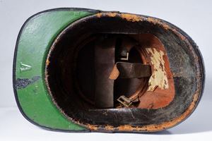 Corpo rigido in cuoio, sul frontale fregio in ottone effigiante busto ed elmo su ascia, spada e fronde di alloro e quercia; alla sommità coccarda metallica tricolore, doppio pom pon di colore rosso con sfere in due grandezze diverse; ai lati fori di areazione con griglie metalliche. I bordi e le superfici laterali con rinforzo in cuoio. Visiera dritta. L'interno con alluda in cuoio, resti di etichetta e cinghie per il fissaggio dei soggoli.