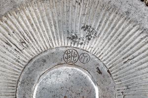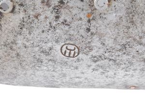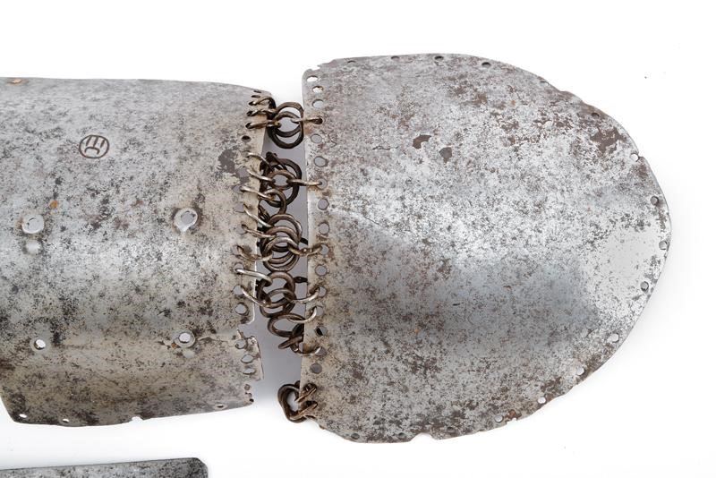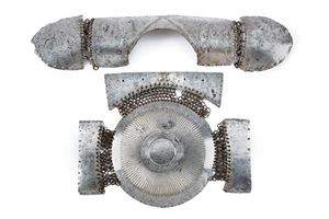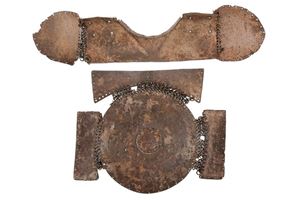 Disco centrale raggiato, rilevato al centro, recante al bordo la marca (tamga) dell'arsenale di S. Irene e un secondo cartiglio con iscrizione in caratteri arabi. Attorno all'elemento centrale tre placche in ferro (quella superiore con vecchia riparazione), il tutto tenuto assieme da maglia ad anelli in ferro ribaditi (piccole mancanze e difetti). Insieme con la protezione per le spalle (dimensioni 33 x 12cm), anche questa in ferro e marcata con il tamga, completa delle due lamelle laterali tenute insieme con anelli (mancanze e piccoli difetti).