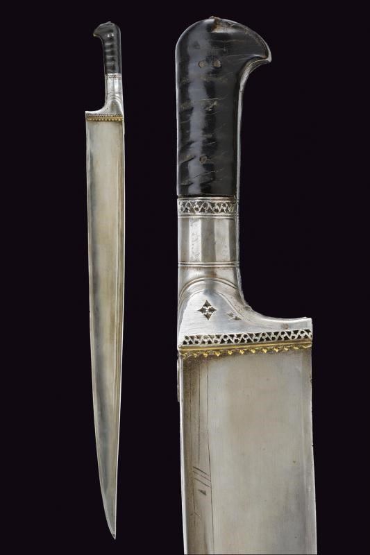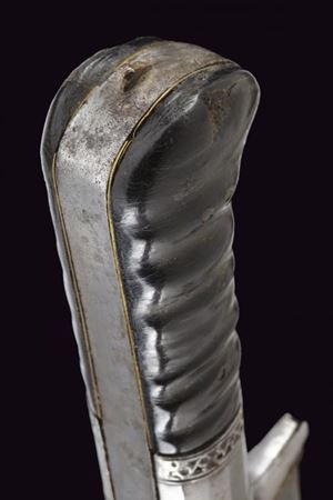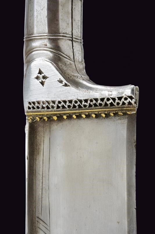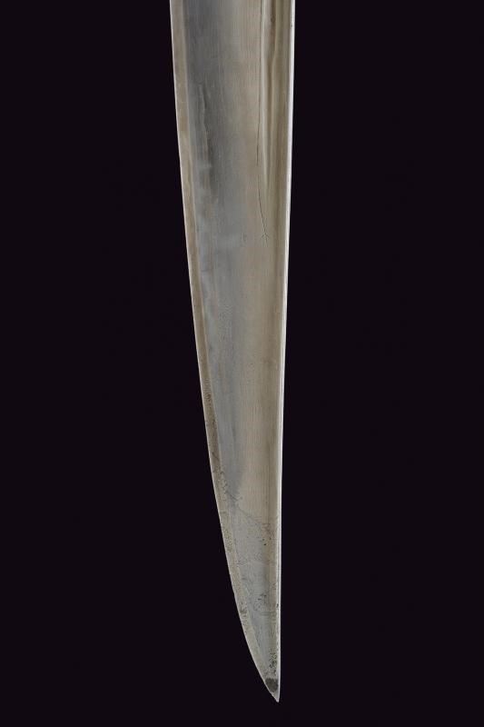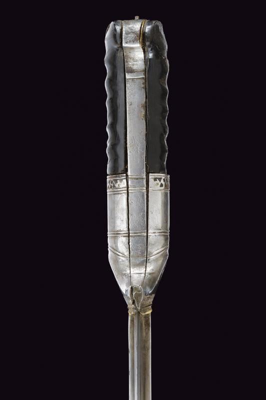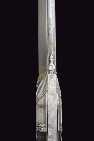 Lunghissima lama dritta in damasco con dorso a "T" e scanalatura, recante resti di incisioni al forte. Fornimento in ferro decorato a trafori, il bordo con una doga in ottone sul lato della lama. Impugnatura con guancette color nero e pomo a testa di uccello stilizzato.