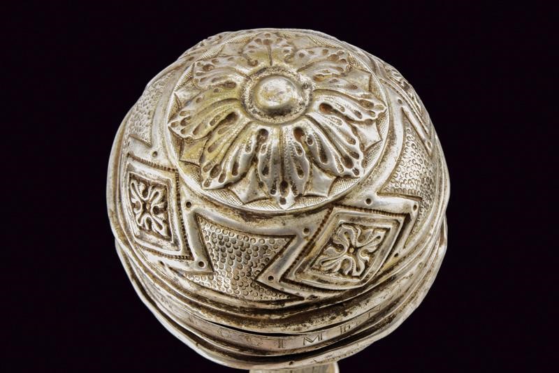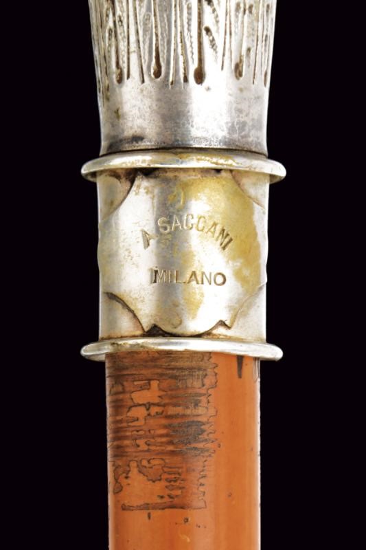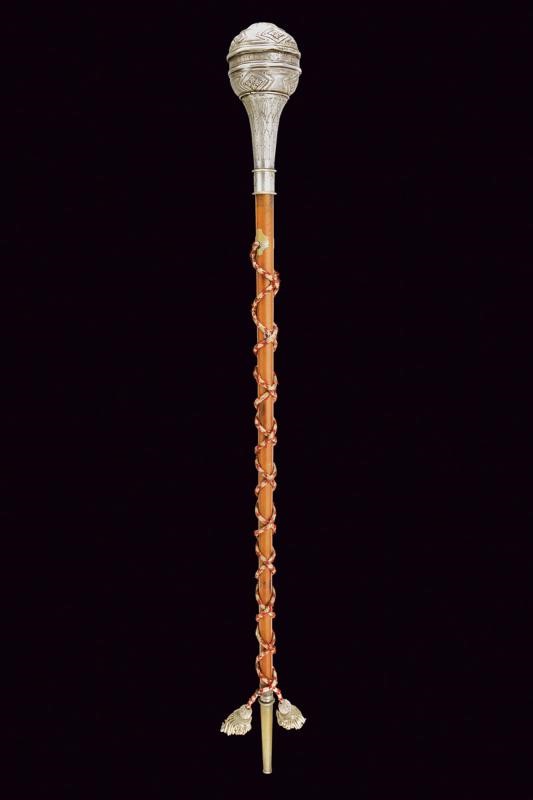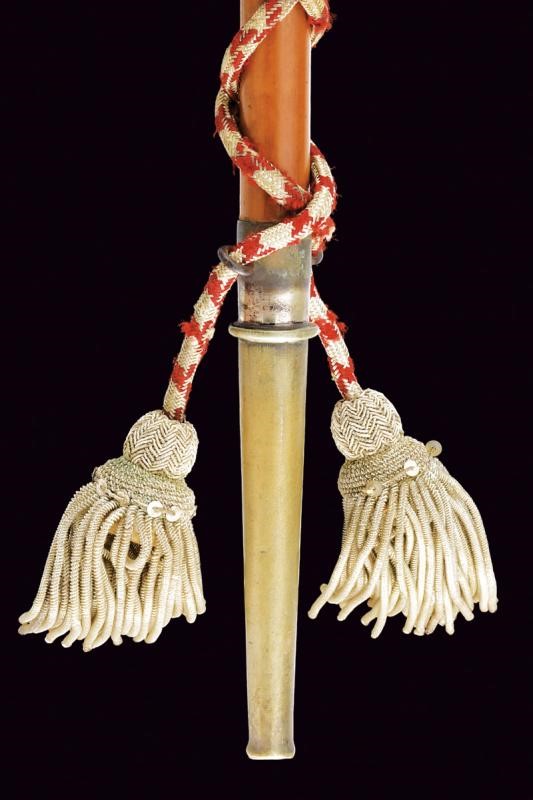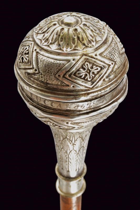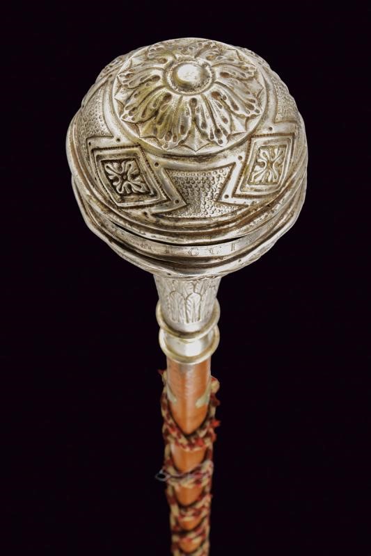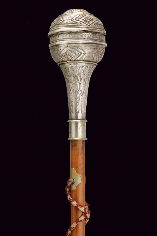 Grande pomo sferico in metallo bianco (argento?), realizzato in due pezzi e decorato a motivi geometrici in rilievo: una serie di poligoni irregolari si intervallano a rombi decorati con simil croci; all'equatore l'incisone "163 REGGIMENTO FANTERIA BRIGATA LUCCA". Collo troncoconico decorato a foglie. La gorbia con estremità rilevate, recante la dicitura della manifattura "A SACCANI MILANO". Fusto in legno con puntale in metallo, su tutta la lunghezza cordone in canutiglia, due nappe sul fondo.