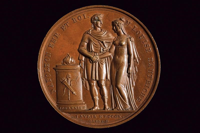 Per le nozze di Napoleone I con Maria Luisa d'Austria. Al recto volti verso destra, opus "ANDRIEU - DENON". Al verso scena con Napoleone e Maria Luisa vicino all'altare con iscrizione "NAPOLEON EMP. ET ROI. M. LOUISE D'AUTRICHE" e data "MDCCCX". Nell'esergo "I AVRIL MDCCCX". Con certificato di autenticità.