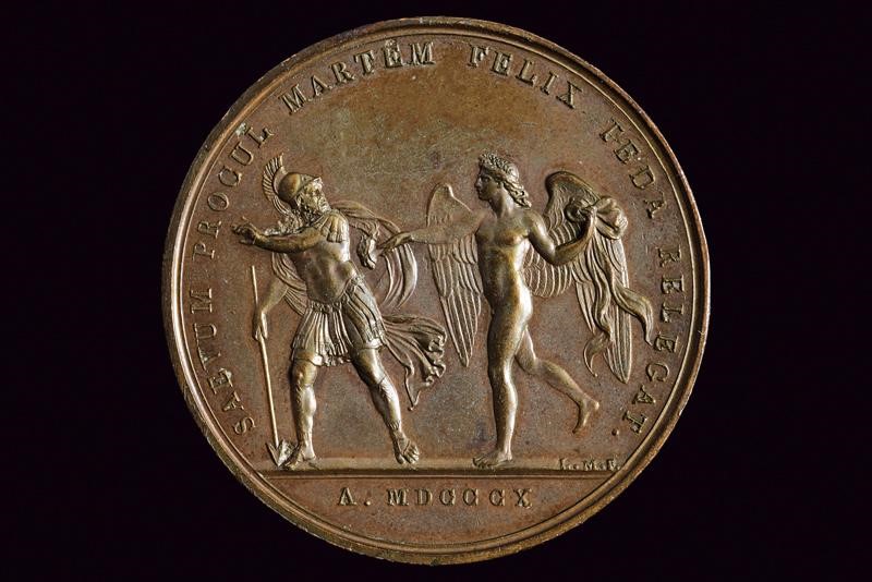 Per le nozze di Napoleone I con Marialuigia D'Asburgo. Al recto volti verso destra con iscrizione "NAPOLEO M.I ET R.AUG. MARIA ALOUISA I. ET R. AUG.", opus "L.MANGREDINI F". Al verso scena ed iscrizione "SAEVUM PROCUL MARTEM FELIX TEDA RELEGAT" e data "MDCCCX".