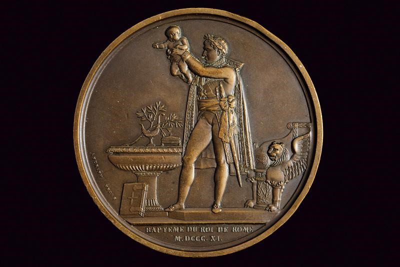 Per la nascita del re di Roma. Al recto busto di Napoleone a sinistra, opus "ANDRIEU FECIT" e "F. DENON". Al verso scena con Napoleone e suo figlio al battesimo. Opus "ANDRIEU FECIT". Nell'esergo "BABTEME DE ROI DE ROME MLDCCCXI". Piccola intaccatura al bordo.