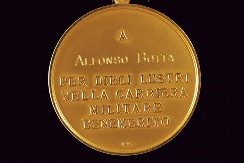 In oro. Sul recto S. Maurizio su cavallo con iscrizione "S. MAURIZIO PROTETTORE DELLE NOSTRIE ARMI". Opus: Ferraris. Sul retro "A ALFONSO BOTTA PER DIECI LVSTRI NELLA CARRIERA MILITARE BENEMERITO". Punzone "Au 917". Su nastro verde. In astuccio in pelle verde. Oro 917/1000. 35 g. Rara.