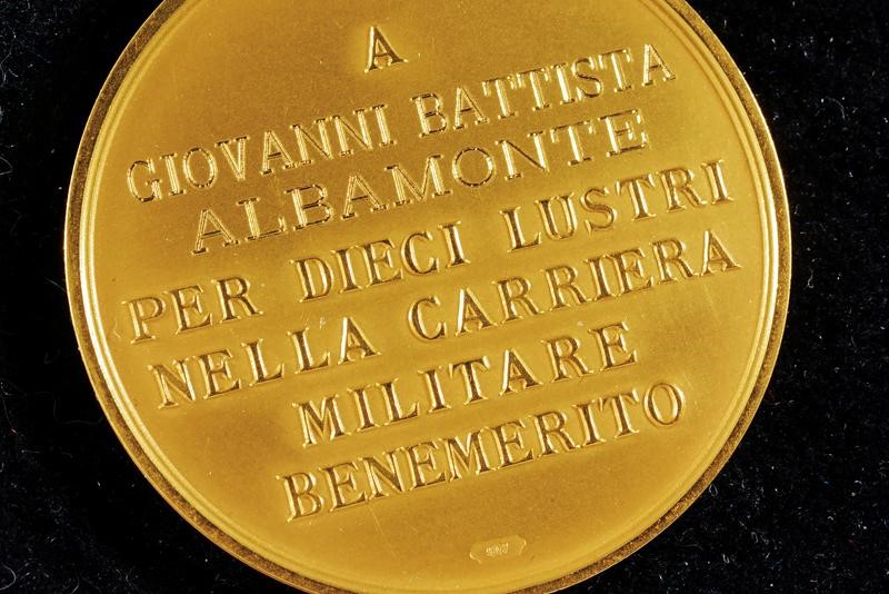 In oro. Sul recto S. Maurizio su cavallo con iscrizione "S. MAURIZIO PROTETTORE DELLE NOSTRIE ARMI". Opus: Ferraris. Sul retro "A GIOVANNI BATTISTA ALBAMONTE PER DIECI LVSTRI NELLA CARRIERA MILITARE BENEMERITO". Punzone "917" (doppio punzone) e "Z". Su nastro verde. Oro 917/1000. 35 g. In astuccio. Rara.