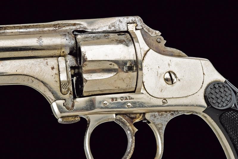 Canna cilindrica rigata dotata di alta bindella, con marcatura al dorso parzialmente leggibile e brevetti sino al 1883. Cal. 32 short centerfire. Anima visibile, intaccature e segni d'uso all'interno. Tamburo a cinque colpi. Cane con cresta pieghevole. Castello con marcatura "32 cal." sul fianco. Guancette in gommadura zigrinata recanti il logo della ditta. Nichelatura probabilmente antica.