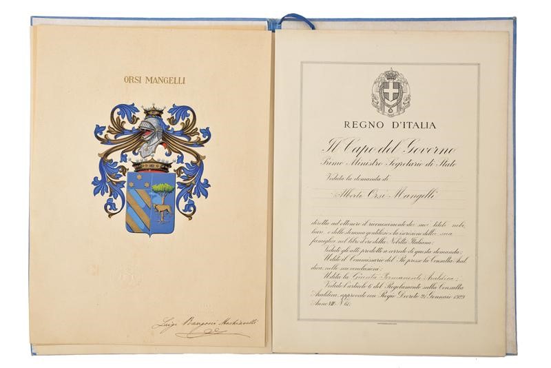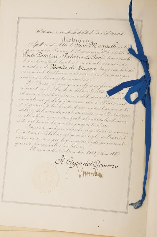 Nomina a conte Palatino e Patrizio di Forlì e Nobile di Ancona di Alberto Orsi Mangelli, documentazione con sigillo del consiglio dei ministri e firma, datata 22 dicembre 1929. Accompagnata dal bellissimo stemma araldico della famiglia, in policromia ed effigiante elmo coronato fra volute, sotto scudo coronato suddiviso in tre parti, una con losanghe, una con tre stelle e una con toro e albero. Conservati in una rilegatura color azzurro (segni del tempo) con copertina rigida decorata al centro con stemmi dorati.