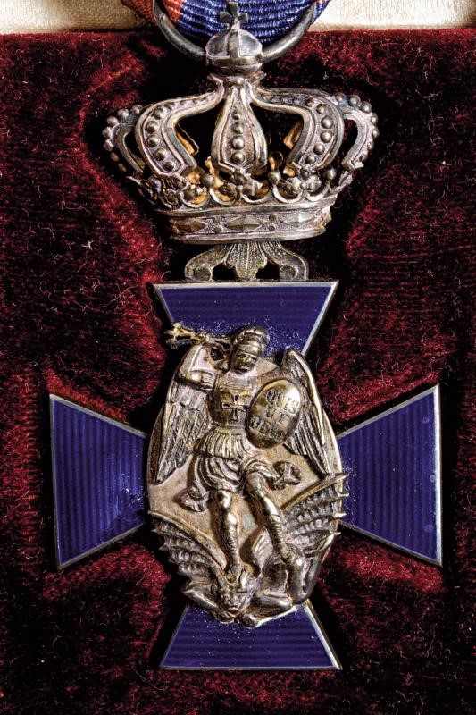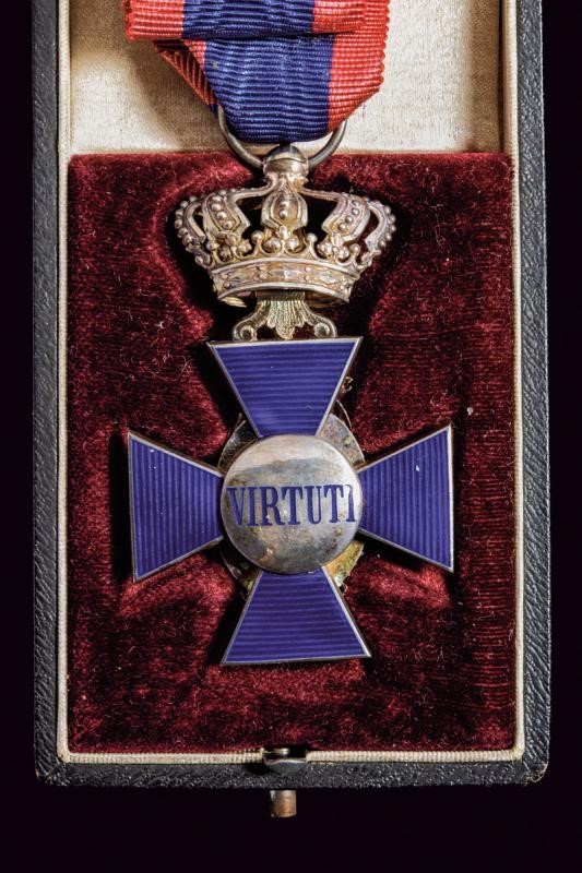 Croce di quarta classe con corona. In argento smaltato, un braccio con chip. Con nastro ed in astuccio originale con marcatura in oro.