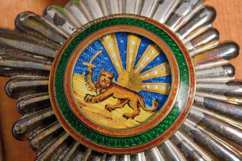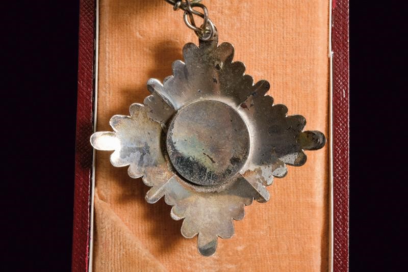Croce da cavaliere, in argento e smalti. Con nastro. In astuccio originale di Bertrand a Parigi.
